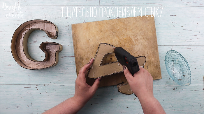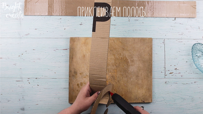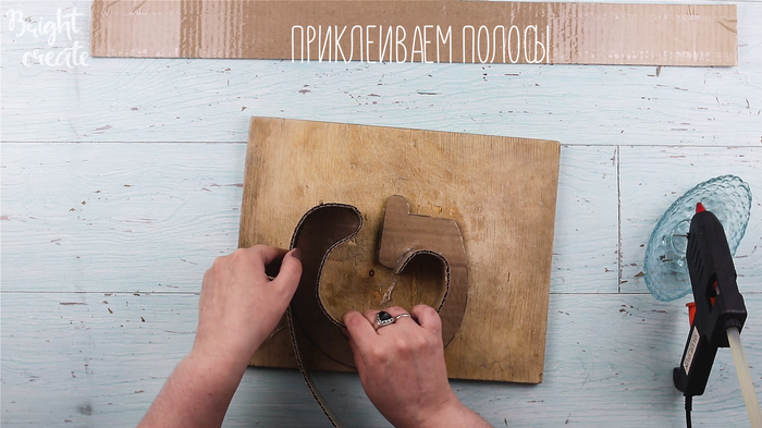 Теперь мы приклеиваем наши полоски к уже вырезанным буквам термоклеем.