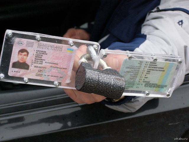 Видел я такого таксиста, ездил он на девятке, а все документы у него примерно такими приспособами и цепью зафиксированы к двери. Говорит, ни один протокол не выписали с тех пор, как привязал. Гайцам не очень охота заполнять бумаги в позе "Зю", а закон водила не нарушает, в предоставлении документов не отказывает.