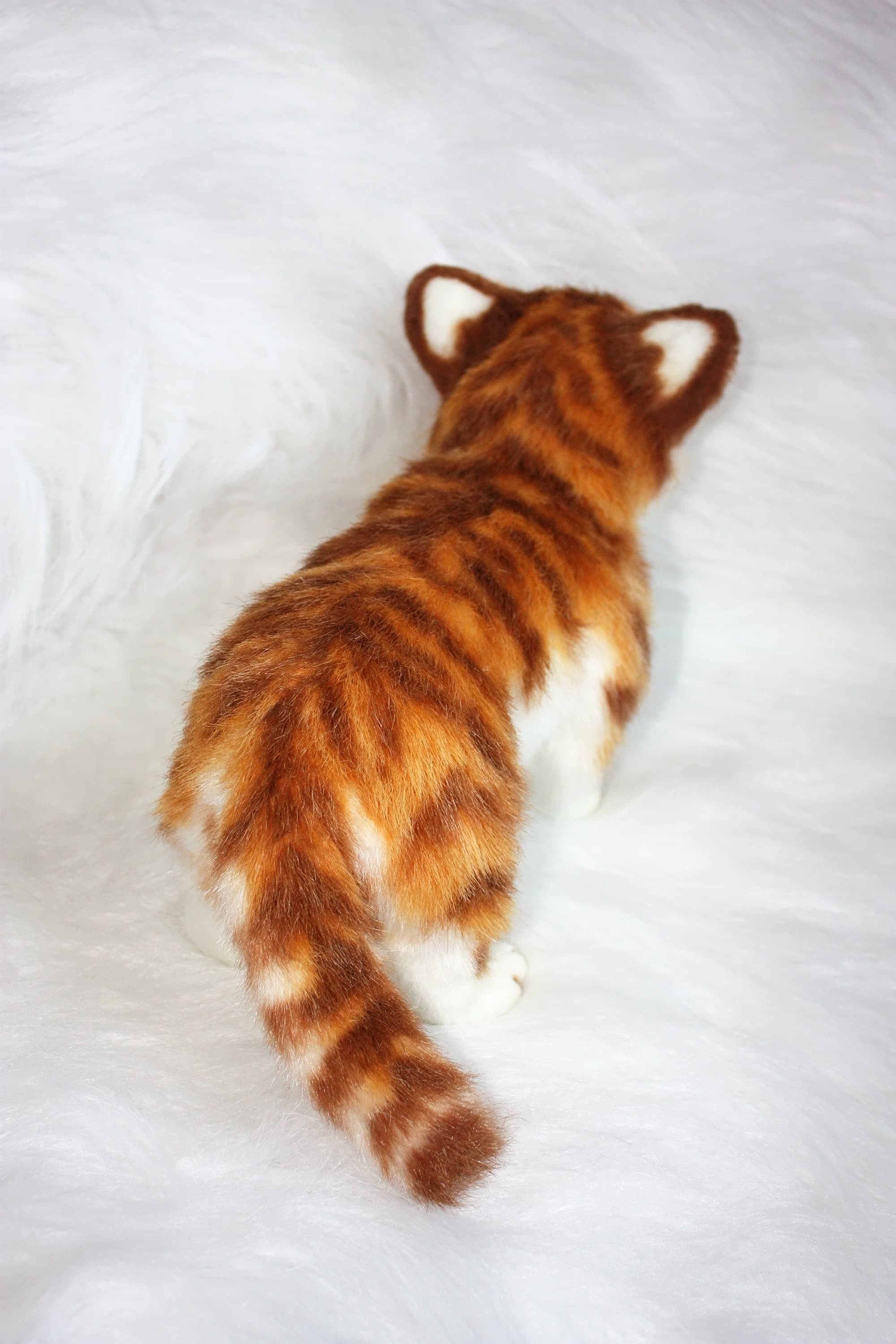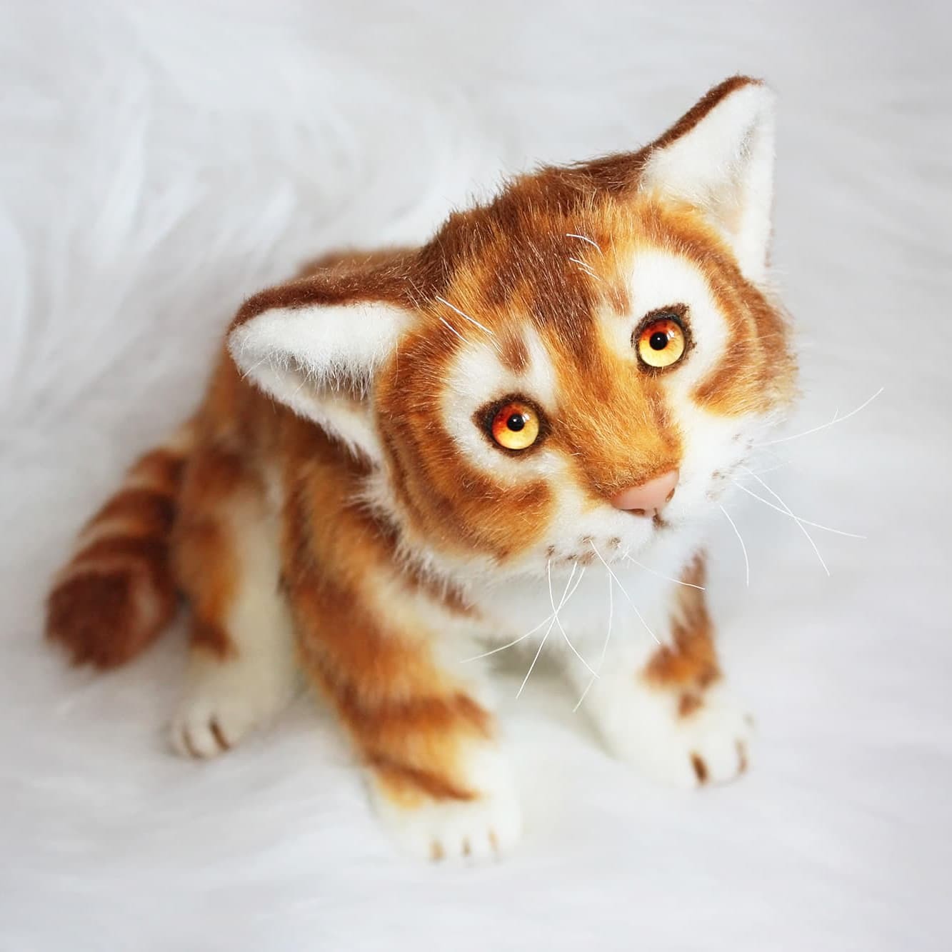В работе использован белый искусственный мех, синтепон и стеклянные глазки. Подушечки лап, веки и нос слеплены из запекаемой полимерной глины. Тигренок утяжелен стеклянным гранулятом и подвижен за счет пластикового скелета. Тонирован масляными красками.