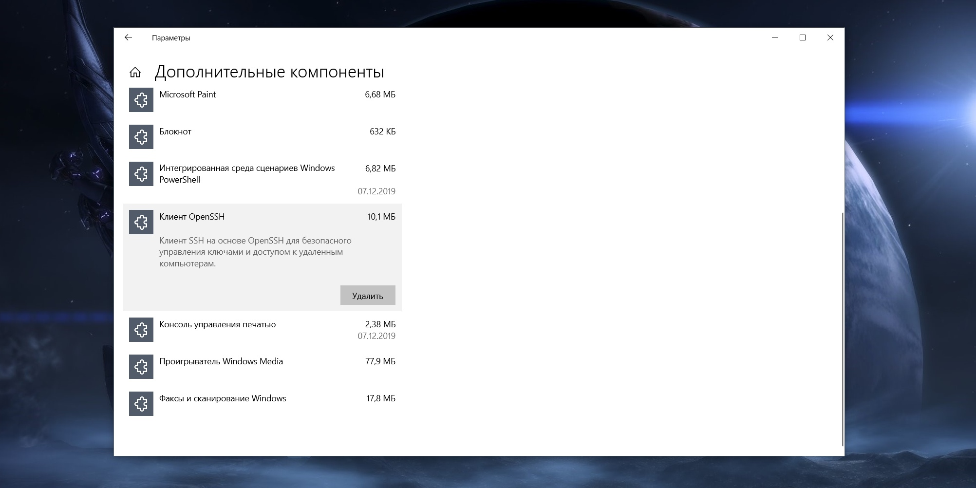 Итак, вот на вашем сервере стоит чистая Ubuntu с вашем паролем. Как с ней поработать? Забудьте про графический интерфейс. Доступ к VPS в массе своей консольный, однако в этом нет ничего сложного. Нам потребуется SSH-доступ, по-русски переводится как безопасная оболочка. Говоря простым языком, это сетевой протокол, который позволяет удаленно рулить вашим сервером. Для его настройки в Windows никаких сложностей быть не должно – проверьте что в Параметрах > Приложения > Дополнительные компоненты установлен клиент OpenSSH: