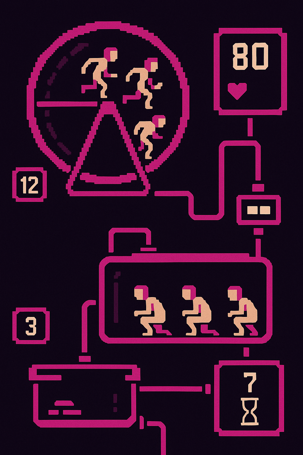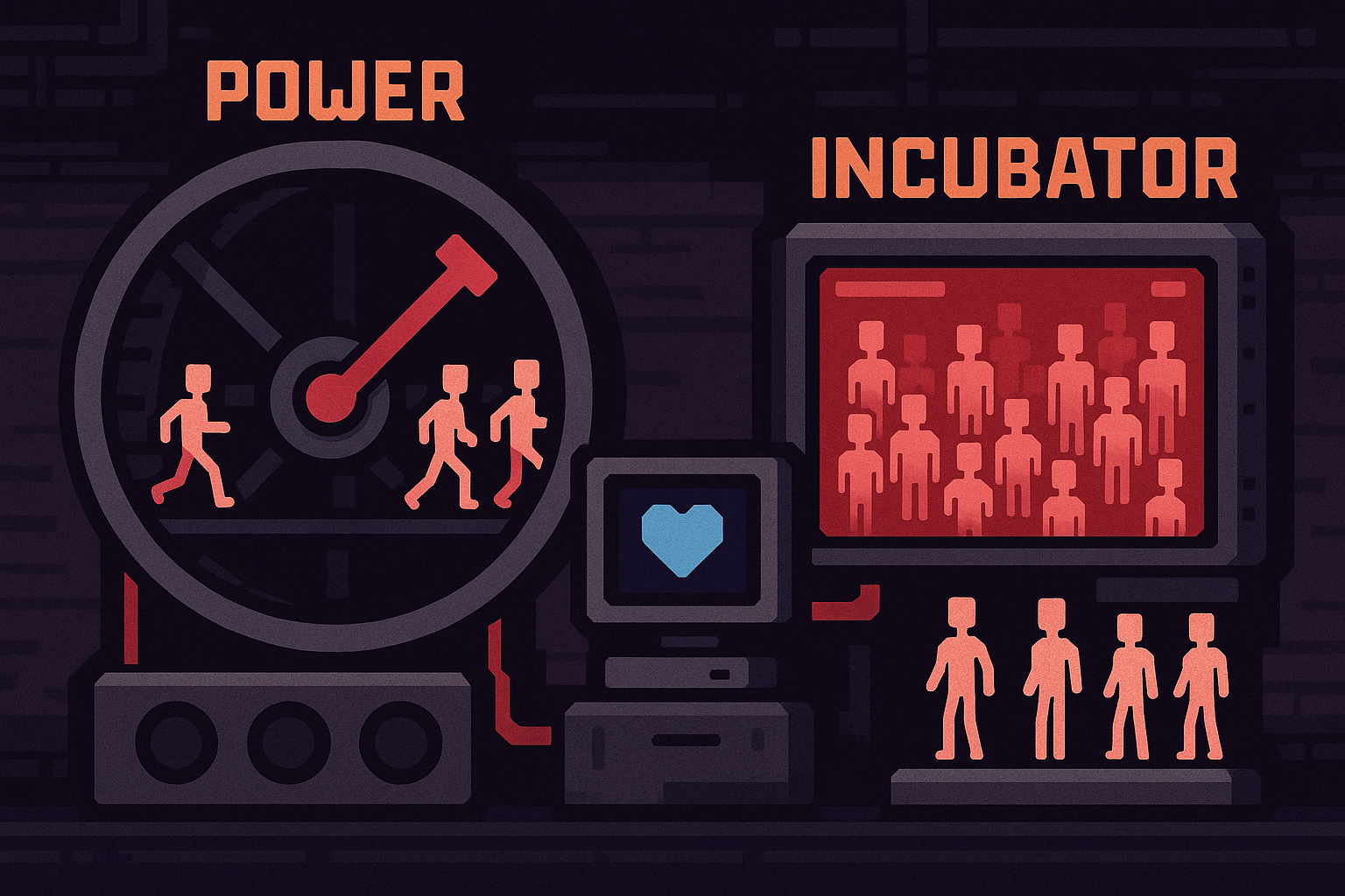 Они работают на колесе, производят еду, размножаются в инкубаторах и умирают в лабораториях. Задача игрока — рационально распределять их усилия, не доводя систему до краха. Если людей слишком сильно перегрузить, они будут дохнуть, и весь цикл рухнет.