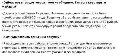 - Да, есть у моей бывшей супруги. Никакого отрицания тут нет. Они были приобретены в 2013-2014 году. Решение об этом было принято на семейном совете. В то время это были хорошие инвестиции. Тогда доллар стоил 30 рублей, сейчас уже 60. Так что если супруга решит продавать, это будут хорошие инвестиции.