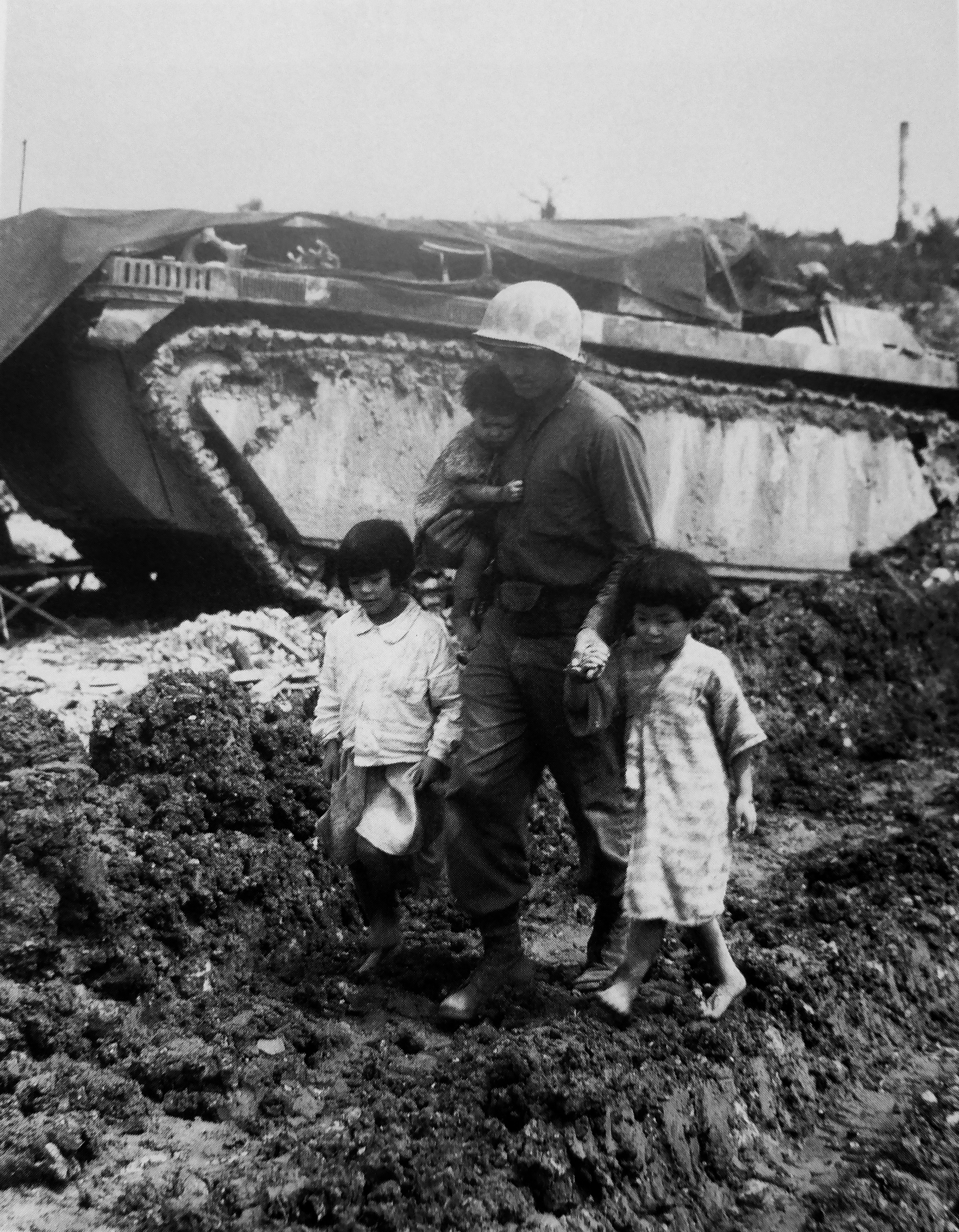 Американский морской пехотинец и маленькие девочки у десантной амфибии LVT-4 на Окинаве.