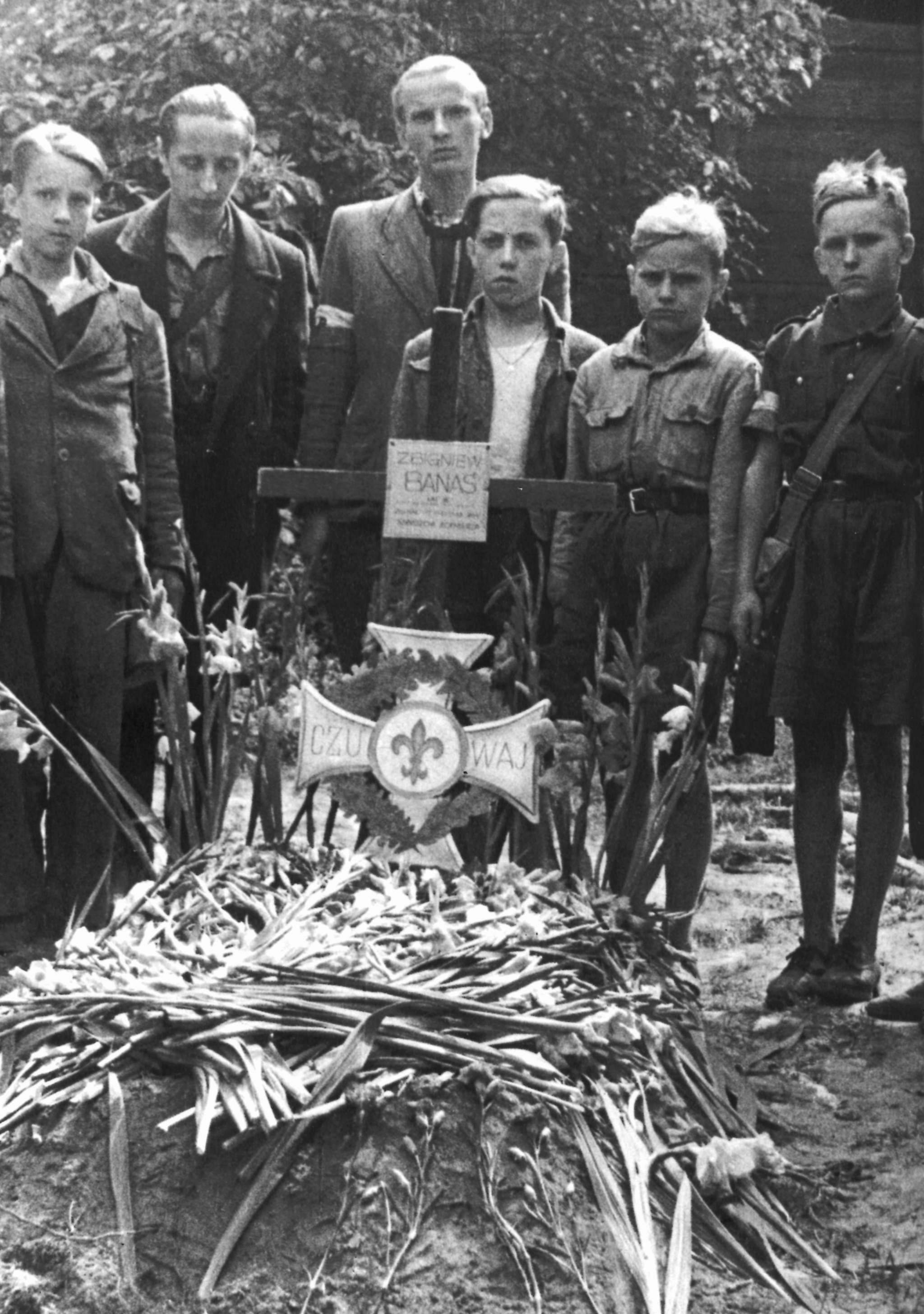 Юные варшавские повстанцы у могилы бойскаута Збигнева Банаша (Zbigniew Banaś), убитого немецким снайпером во время доставки почты в больницу в районе Powiśle.