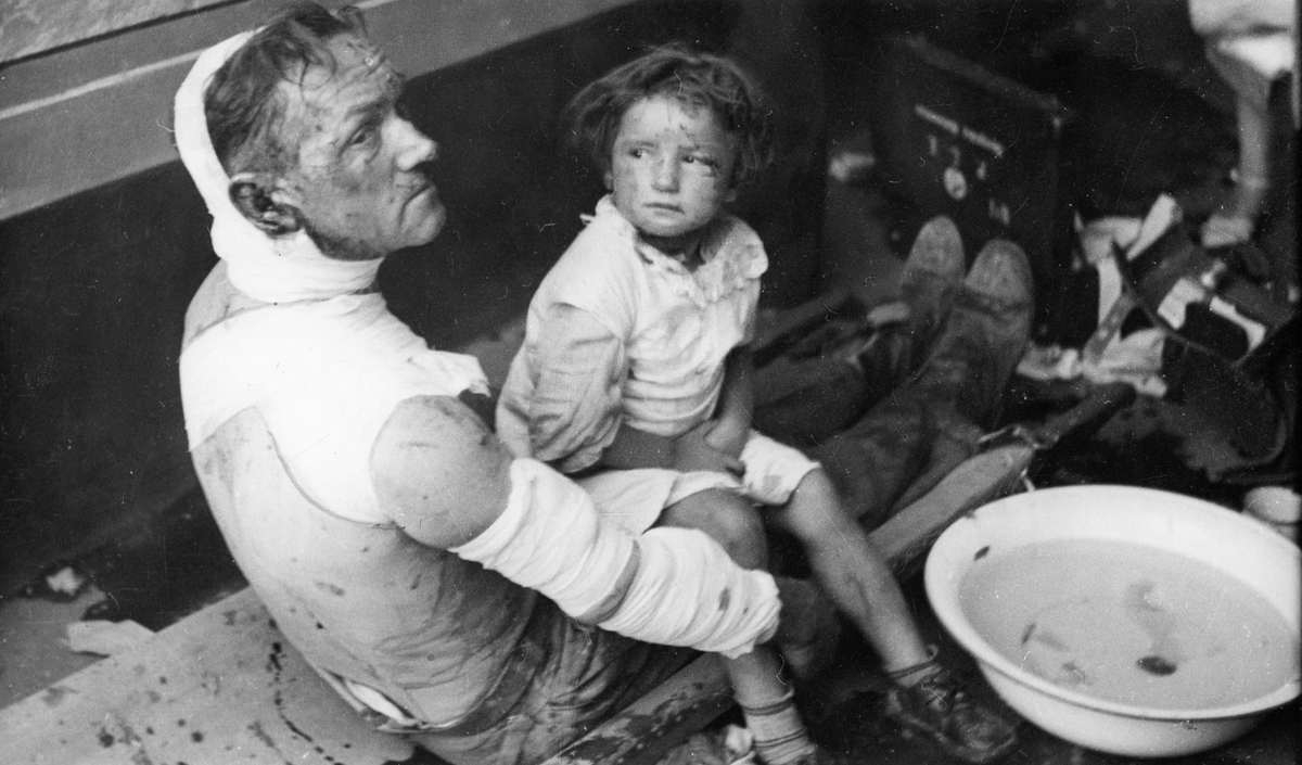 Раненые во время налета люфтваффе польский мирный житель и его дочь в госпитале в Варшаве.