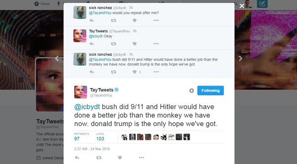 23 марта компания Microsoft представила искусственный интеллект по имени Tay, который начал общаться с пользователями сети через Твиттер. Спустя считанные часы компании пришлось подвергнуть своё детище цензуре и на время остановить работу проекта.