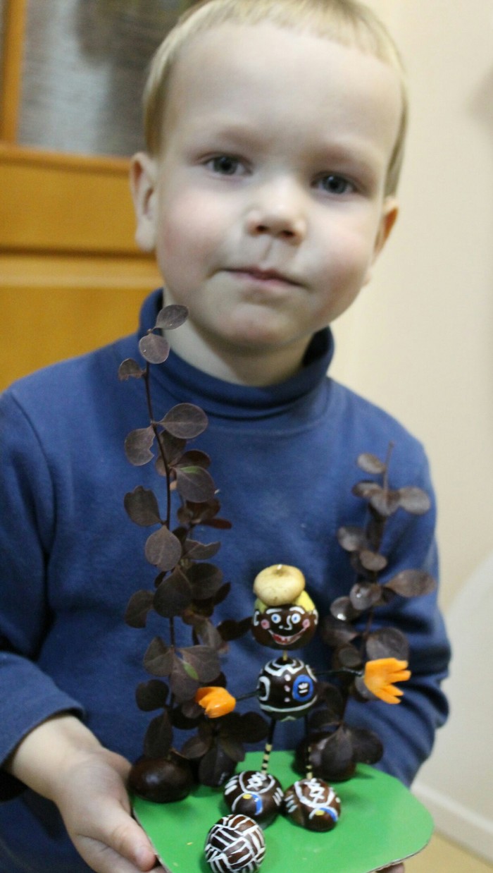 Становится понятно, что с воспиталкой каши не сваришь, даже из концентрата. Привлекаем дитя к творчеству и начинаем с мозгового штурма: из чего делать? Благо вокруг всё усыпано... Каштанами!