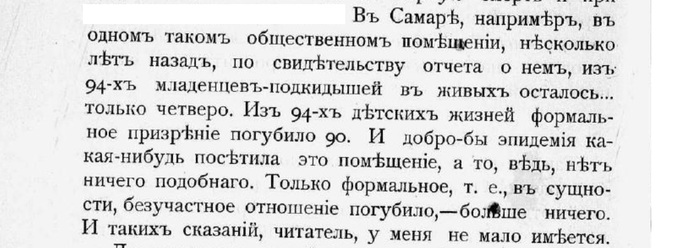 "ЕКАТЕРИНОСЛАВ. Городской санитарный врач Ребинин сделал врачебному инспектору сенсационный доклад о земском приюте для подкидышей. Оказывается, что в приюте, на который тратится до 100000 руб., из поступающих ежегодно 1000 младенцев умирают более 800. Дети умирают без врачебной помощи. Двор приюта загрязнен экскрементами и помоями. Няни приюта передали Ребинину, что звонок от люльки, куда кладут детей, не действует и детей часто вынимают оттуда замерзшими. К Рождеству в приюте появились холерные больные."