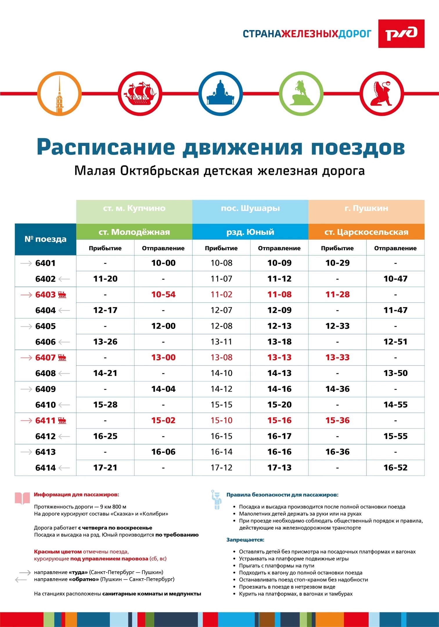 В Санкт-Петербурге, где есть целых 2 трассы детской железной дороги, северная и южная, торжественное открытие прошло в 2 этапа: Южный участок в Пушкине открылся вчера, а Северный, в Озерках, открылся сегодня. На обоих участках можно прокатиться с четверга по воскресенье. Поезда ходят по расписанию – все по-взрослому!