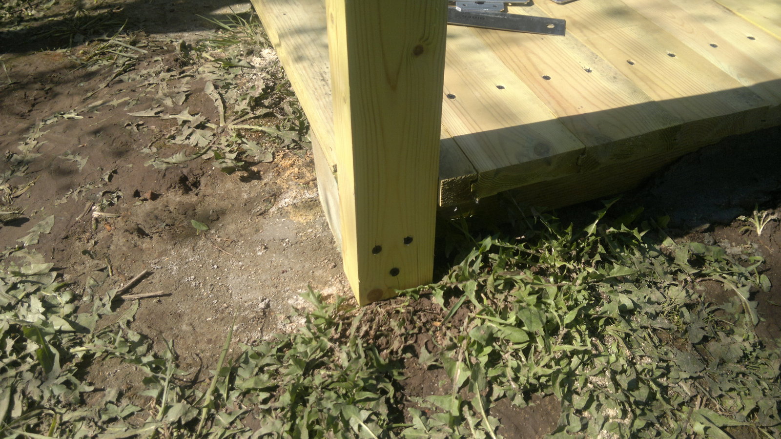 3-3) Потом устанавливаем несущий деревянный брус (3шт.), в моём случае 3000*100*100. Чтобы у нас всё было +- по начерченным размерам нужно установить брус идеально по уровню относительно земли и между собой. Для этого я сделал «крутой» бетон (немного больше цемента) и как устанавливают «маяки» выставил брусья в уровень. Если в простонародье, то под каждый брус 3 лепёхи раствора, пока раствор не застыл – регулируем уровень! Времени для этого предостаточно. Смотрим ниже фото.