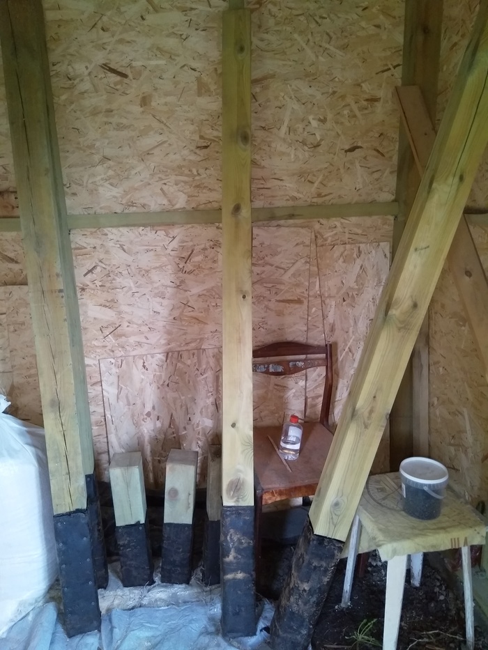 Сначала приготовили 4 основные стойки. Брус 10х10 см, длина около 2,5 м. Обработали рубанком, пропиткой антисептиком. Нижнюю часть (чуть больше 50 см) обмазали гудроном, сверху обернули рубероидом. Т.к. эта часть будет в земле. Не знаю, есть ли какая-то специальная технология на эту тему, но такой способ уже был опробован при пристроен веранды 11 лет назад и показал себя отлично.