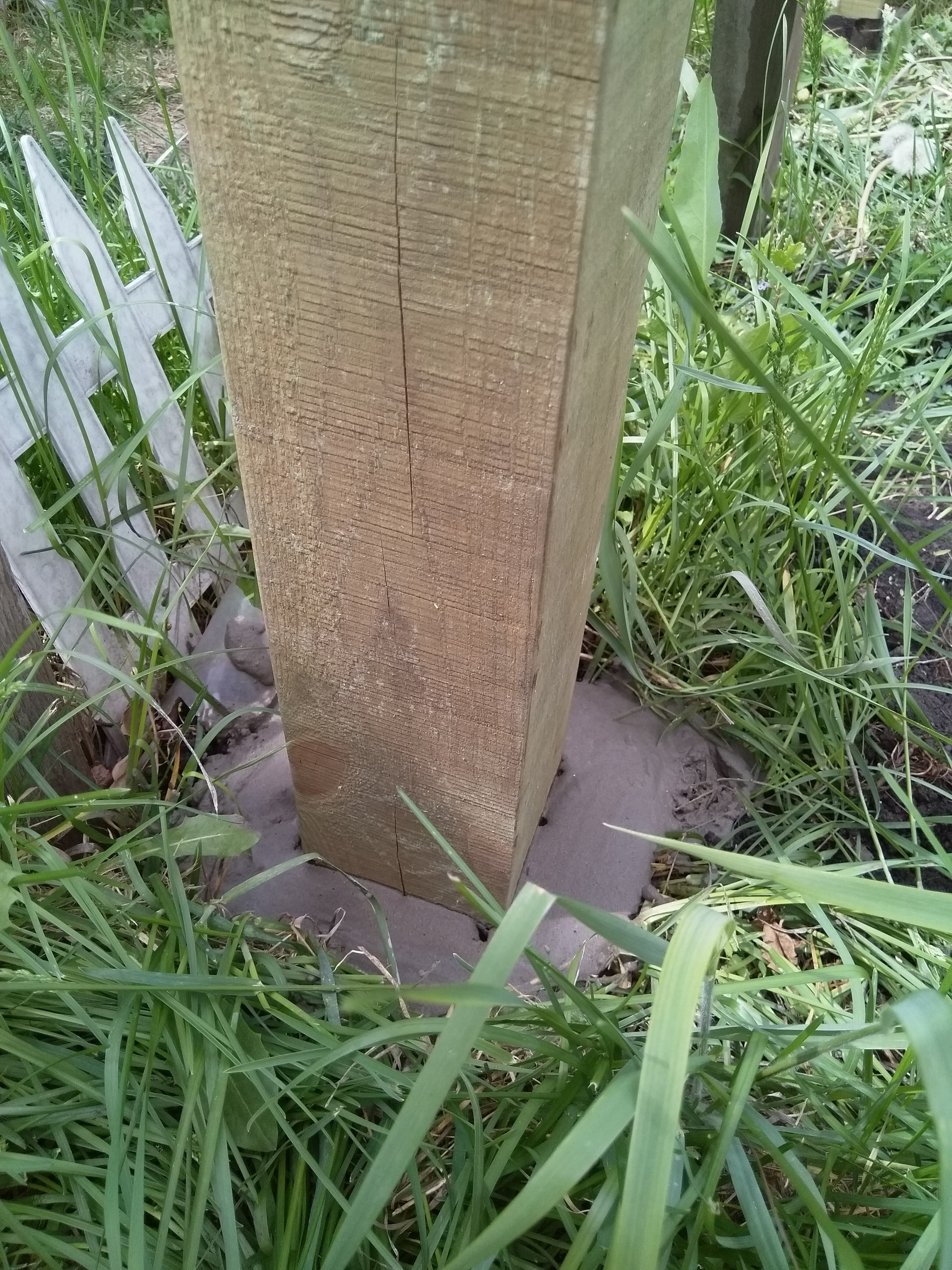 Выровняли столбы. Для больших столбов установили распорки. Для маленьких "пеньков" мудрить не стали ничего. Соединили их сразу между собой по длине будущей скамейки бруском 4х5 см. И подперли короткими железками, чтоб не увело. Оставили в таком виде где-то на неделю.