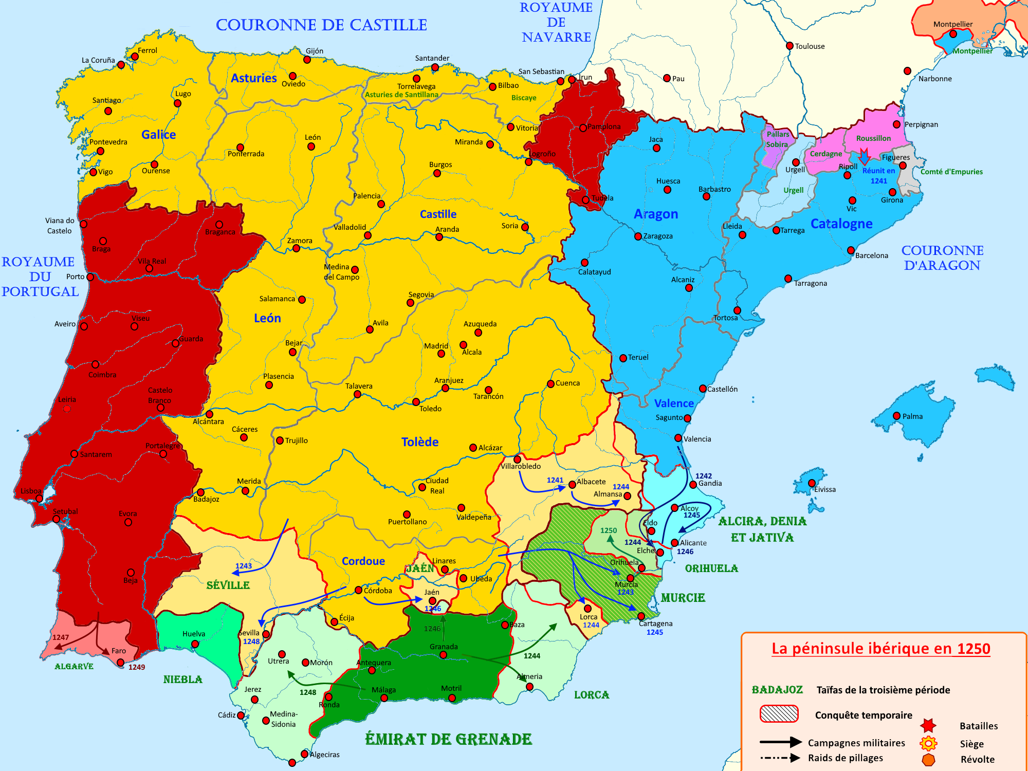 3) среди местных христиан не было единства, крупные королевства - объединённое Леона и Кастилии, Португальское, Арагонское спорили между собой, а ведь была ещё мелочь типа княжества Астурийского, королевства Галисийского, королевства Наварра и т.д. О единой Испании не было и речи
