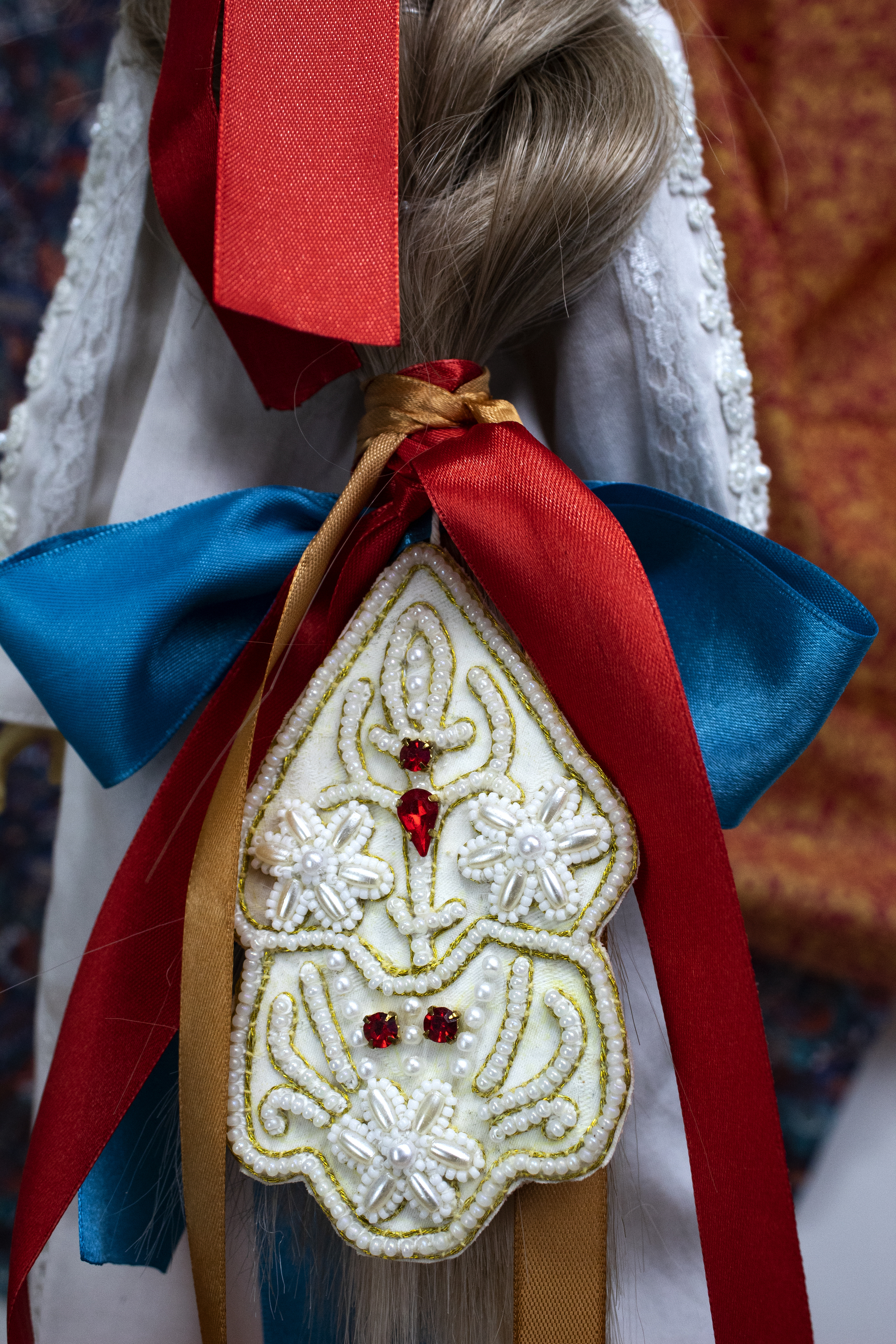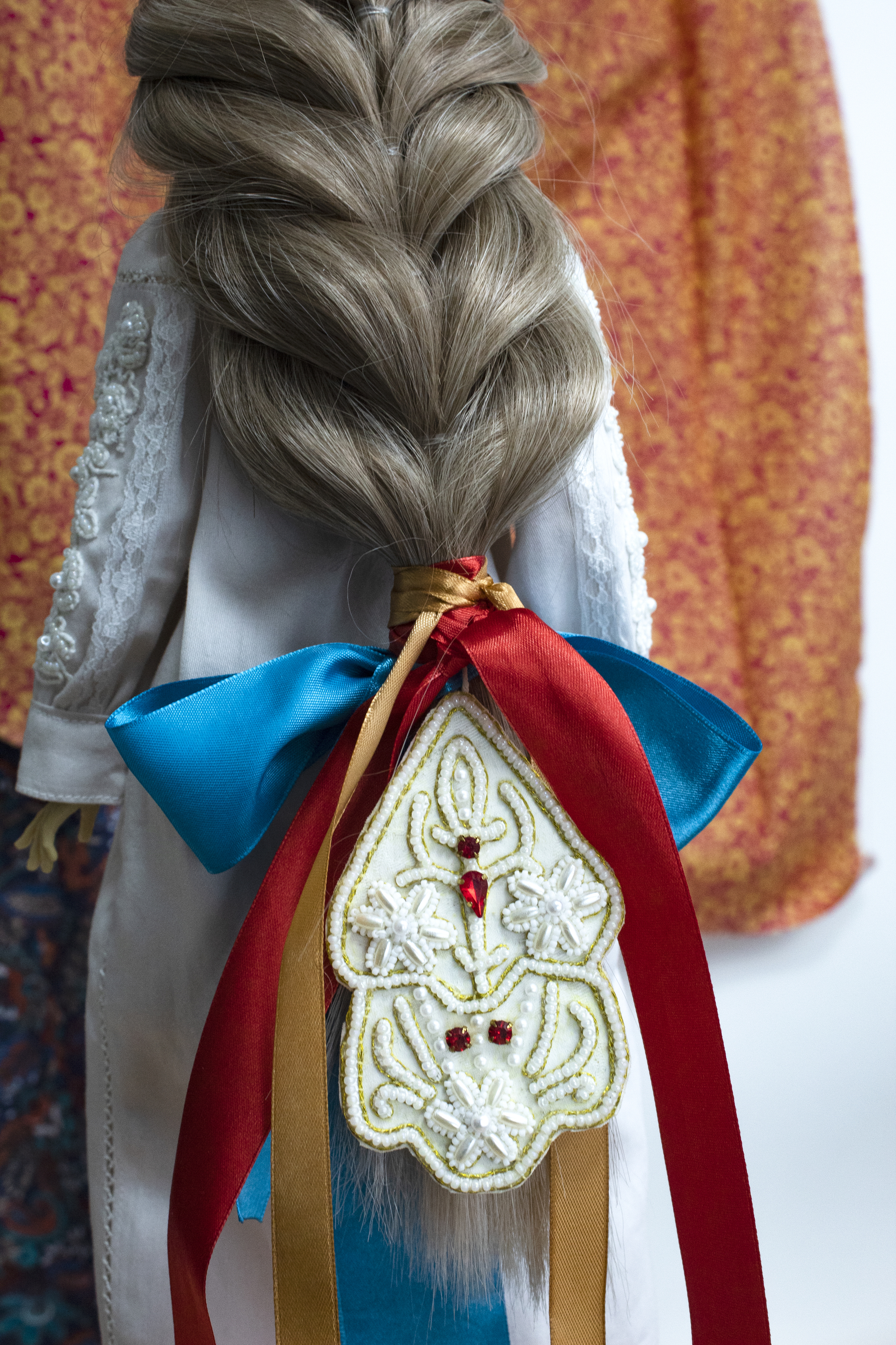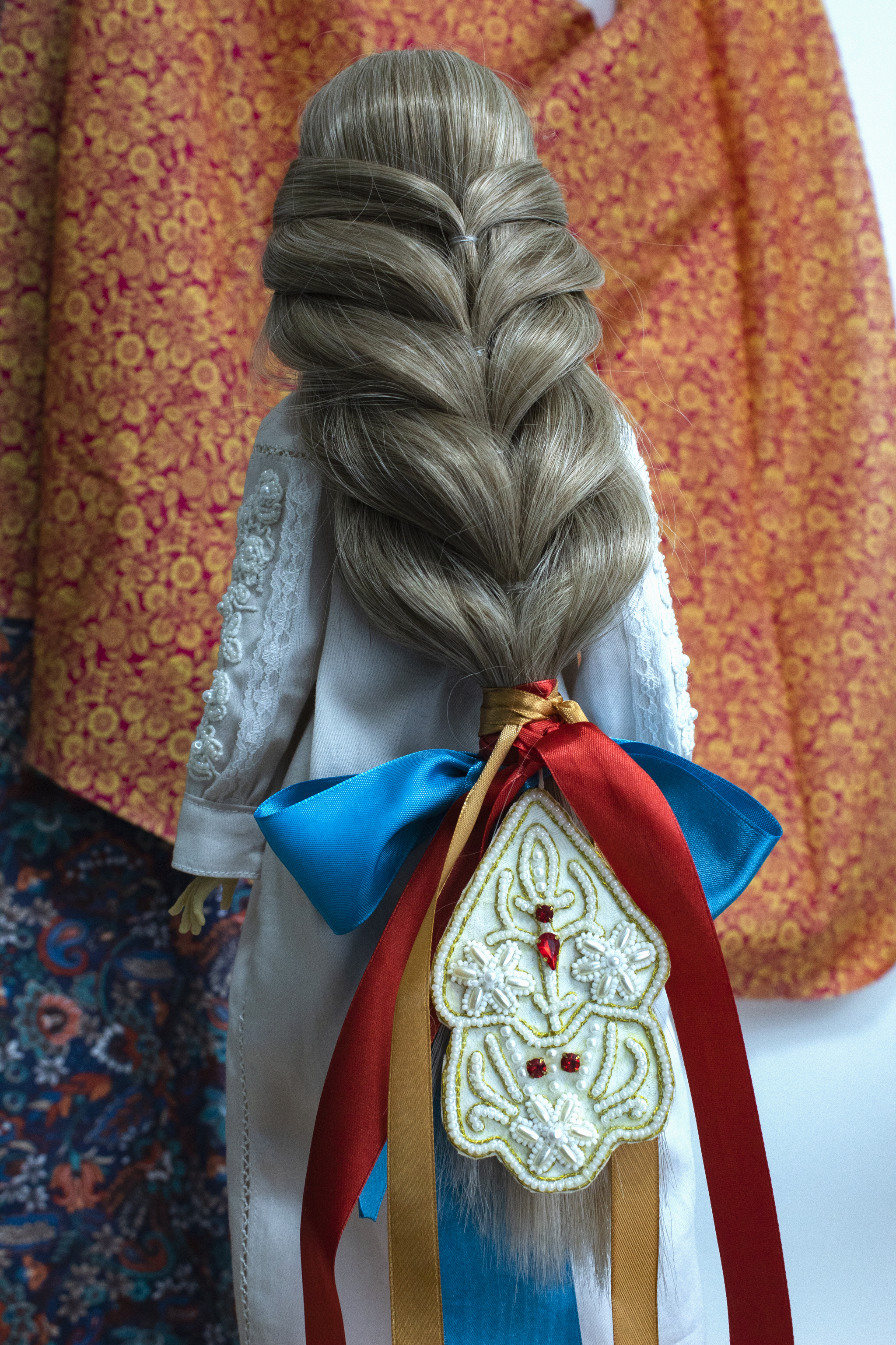 Я украсила традиционным способом (концы косы видны). Ещё косник надевали на самый конец волос, подгибая их. Но такой способ для этой куклы не подходит. Уж дюже дева на косу богата.