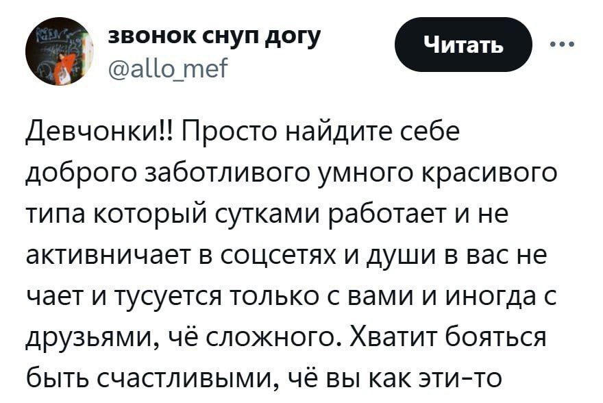 1393 KOPOBOPOTEHb Противозачаточные шутки Девочки, хватит! 5 месяцев назад Юмор Мужчины и женщины Отношения Скриншот Сарказм X (Twitter) 53 8 3 1 Ещё 0
