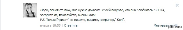 onai Девушка просила помочь 10 лет назад Насколько понял Я, Мария просит засорить ей личку (правда я не понимаю зачем) словом "коп". Поможем? ВКонтакте Паблик Просьба