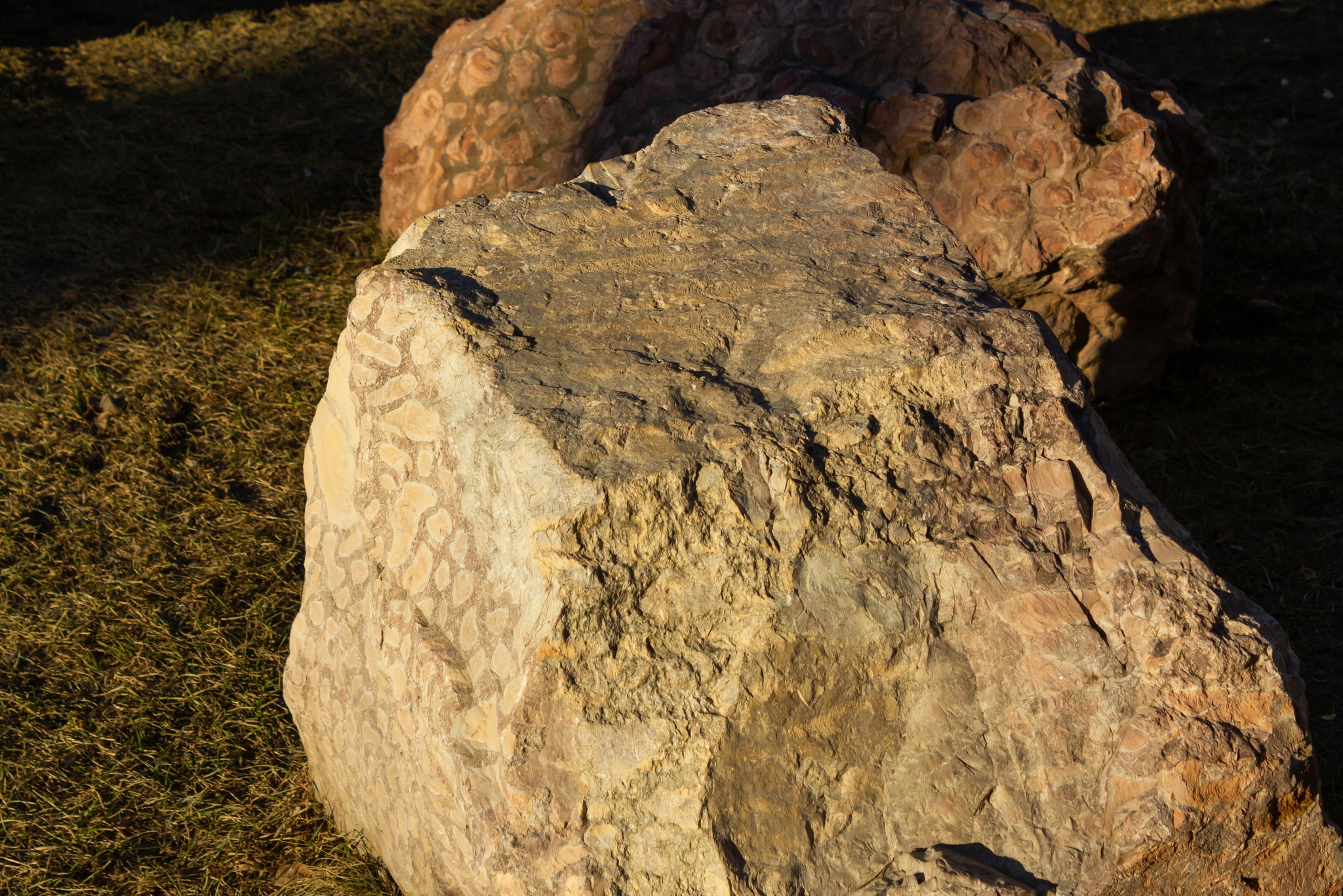 В центре Тюмени расположились ни много ни мало строматолиты протерозойского возраста, тонийского периода. На улице Республики между домом 44 и 42 на полянке вытоптанного газона уютно расположились три камня альпийской горки, нас интересуют два из них, которые расположены ближе к улице. На них сразу бросается в глаза странная текстура, в которой подойдя поближе, можно узнать строматолитовые постройки.