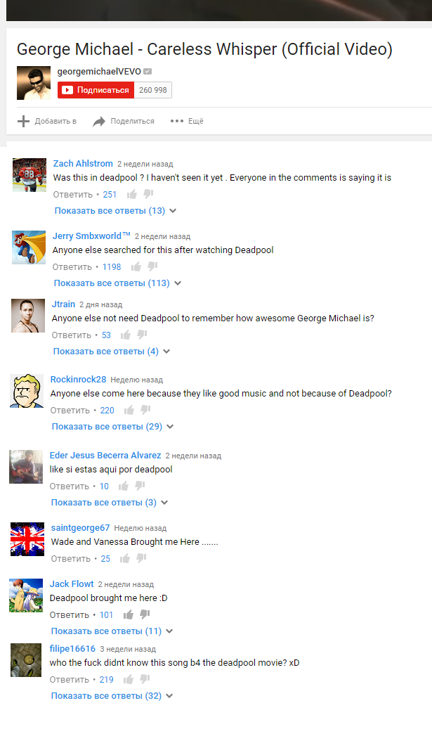 ra1n1 Действительно, есть такие кто не знал эту песню до дэдпула? 9 лет назад А песня то шикарнаяhttps://www.youtube.com/watch?v=izGwDsrQ1eQ Дэдпул Careless whisper Per YouTube