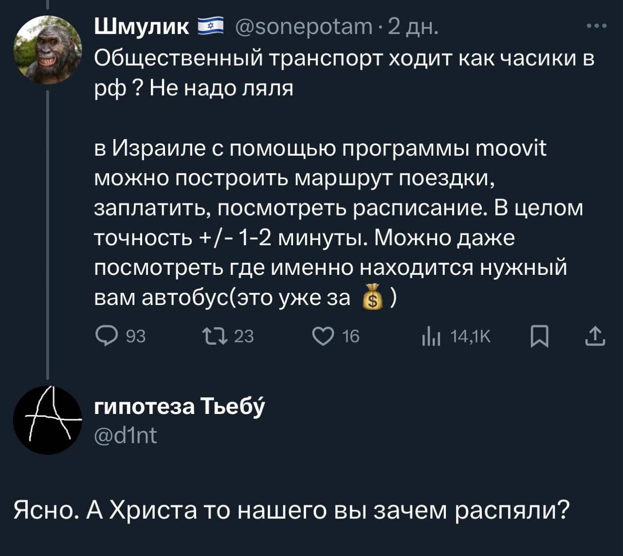 9975 Veliki.Kormhii Транспорт Действительно почему ?2 9 месяцев назад Юмор Израиль Скриншот Комментарии X (Twitter) Транспорт Евреи Общественный транспорт Незнание Приложения на смартфон 385 24 21 7 5 Ещё 0