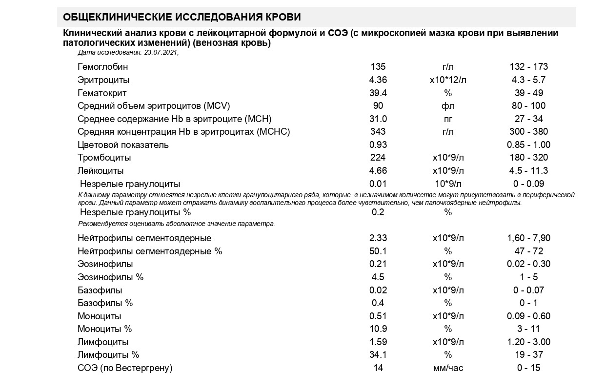 В первое время разъезжались показатели крови, очень быстро уставал, сгорели мышцы и долго сходила отёчность от преднизолона и дэксы, шелушилась кожа. Из долгоиграющих побочек, которые со мной до сих пор: астигматизм, незначительный, офтальмолог сказала, что он всегда был, но глазные мышцы немного погорели от химии и больше не ничего не компенсируют. Очки я не ношу (врач не рекомендовала), делаю зарядку для глаз. В случае сильного переутомления на работе (за компом) - к вечеру немного двоят/троят источники света, но в целом терпимо. Вторая боль - зубы, я теперь постоянный клиент стоматолога. Но это также незначительный недочет с учетом возможности имплантирования. Я жив и это самый главный факт! Из ограничений - запрет инсоляций, физиотерапии, правильное питание по возможности. Немного ограничил алкоголь, ибо появилось жуткое похмелье. Хотя скорее всего просто стал старше и больше не могу тусить как в 18))))) Кровь в итоге восстановилась до следующих показателей. Считаю, что отличные показатели для 35 лет после того песеца, который со мной произошёл)) Всё в референсных значениях, каеф))