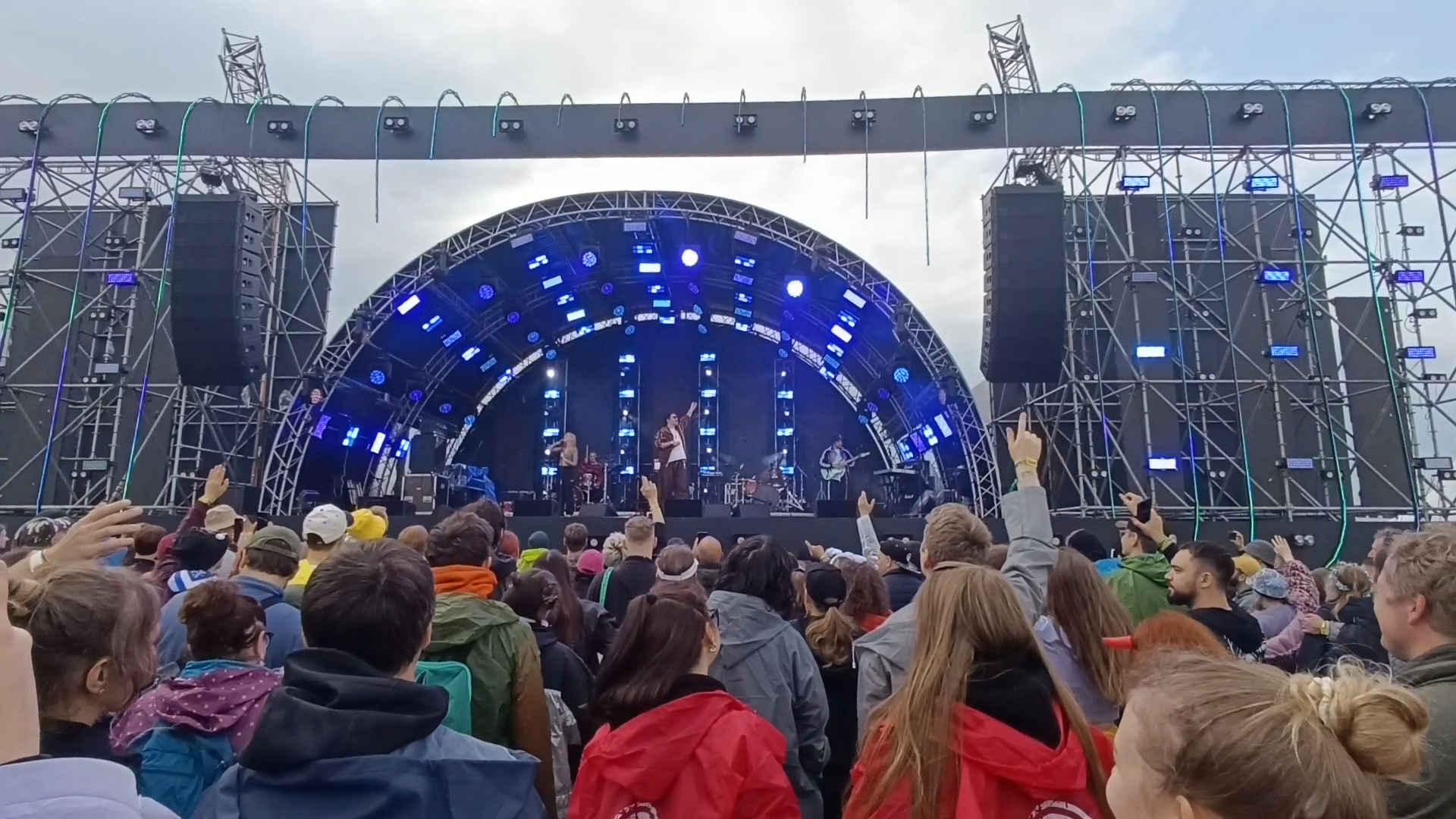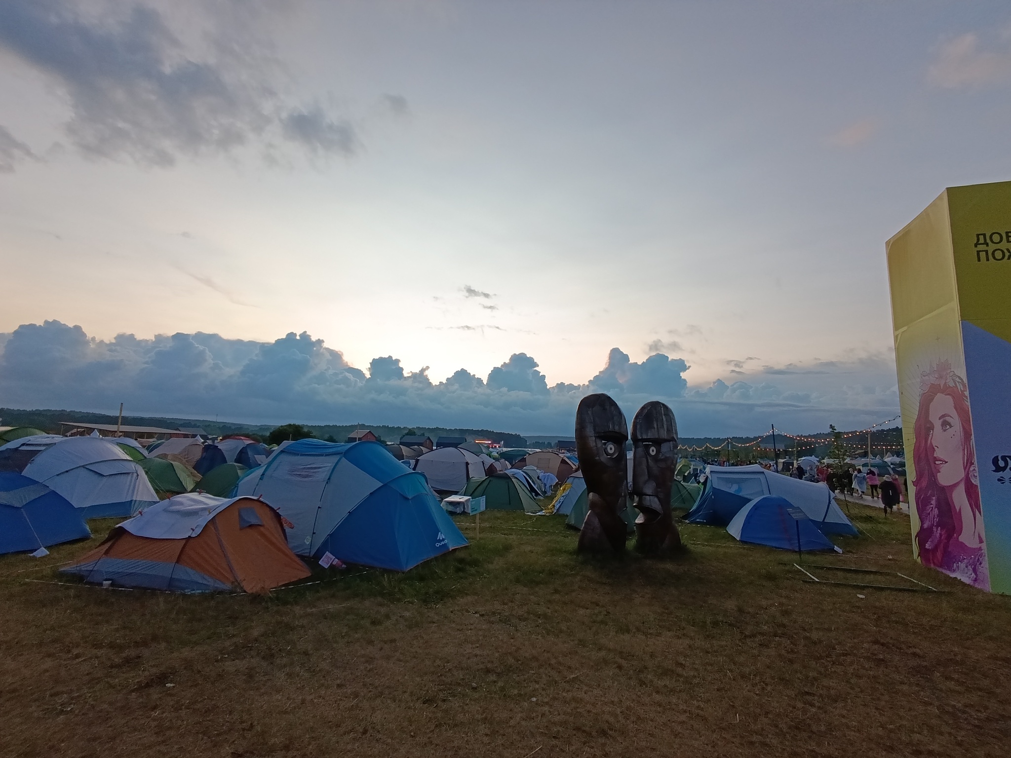 Облака и палатки лагеря Маяк рядом c инсталляцией двух голов с референсом на обложку альбома Division Bell группы Pink Floyd