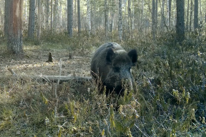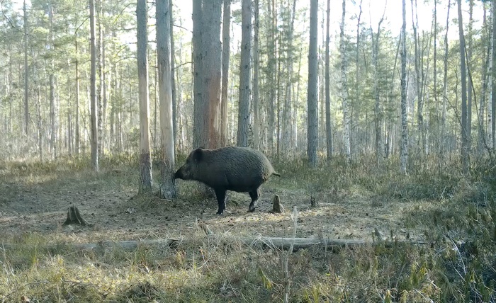 В пригороде Петербурга в видеоловушку мне попалась взрослая кабаниха. Не удивительно, что сейчас она одна. По заметно округленному животу самки видно, что она беременна, и со дня на день родит. За несколько дней до родов кабаниха на время покидает своё стадо, в которое вернётся уже с кабанятами. До важного события остались считанные дни, и сейчас будущей маме необходимо хорошо питаться.