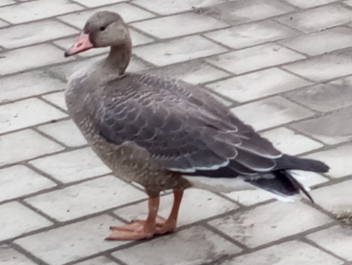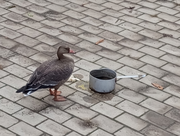 Привет всем! Место действия: Донецк. Температура: +10 градусов. Утром обнаружила это чудо. Отец утверждает, что слышал курлыканье гусей ночью, а приложение, определяющее птиц (Merlin Bird ID) заявляет, что это белолобый гусь. Но тут бабушка надвое сказала. Гусей никто поблизости не держит, не думаю, что он домашний.