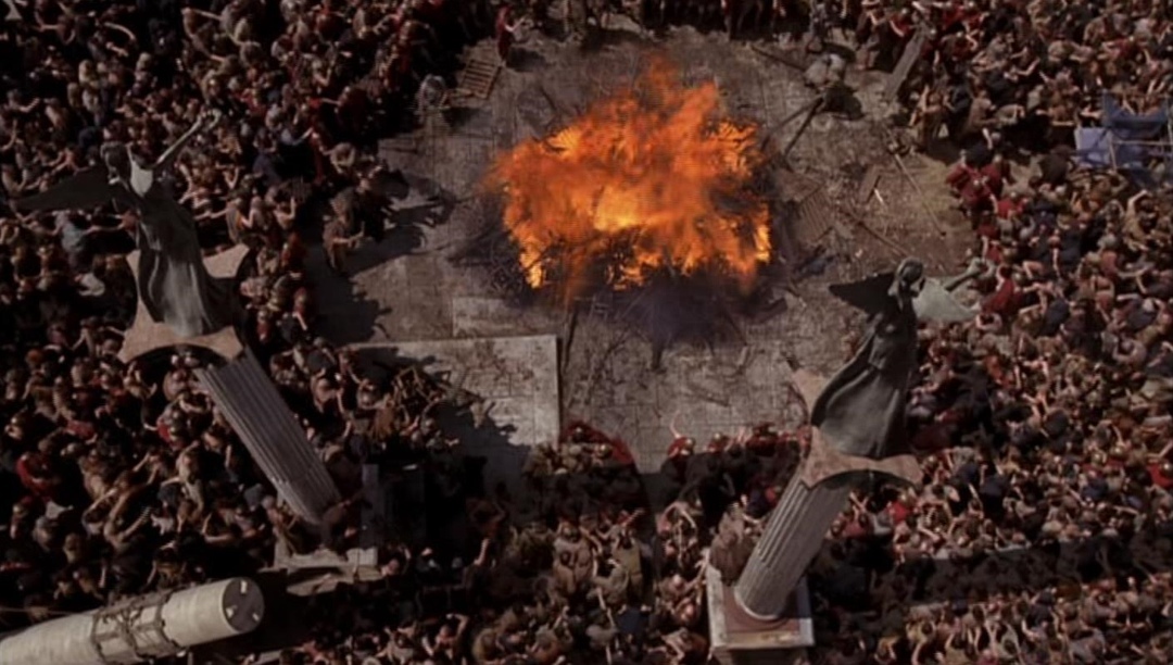 Когда всё закончится, радостный Марк Брут заявит Цицерону, как старшему из консуляров, что республика освобождена от тирании. Ватага радостных “освободителей” в окружении гладиаторов пойдет на Форум, где зачитает обращение к гражданам. Толпа встретит восторженные слова Брута гробовым молчанием…