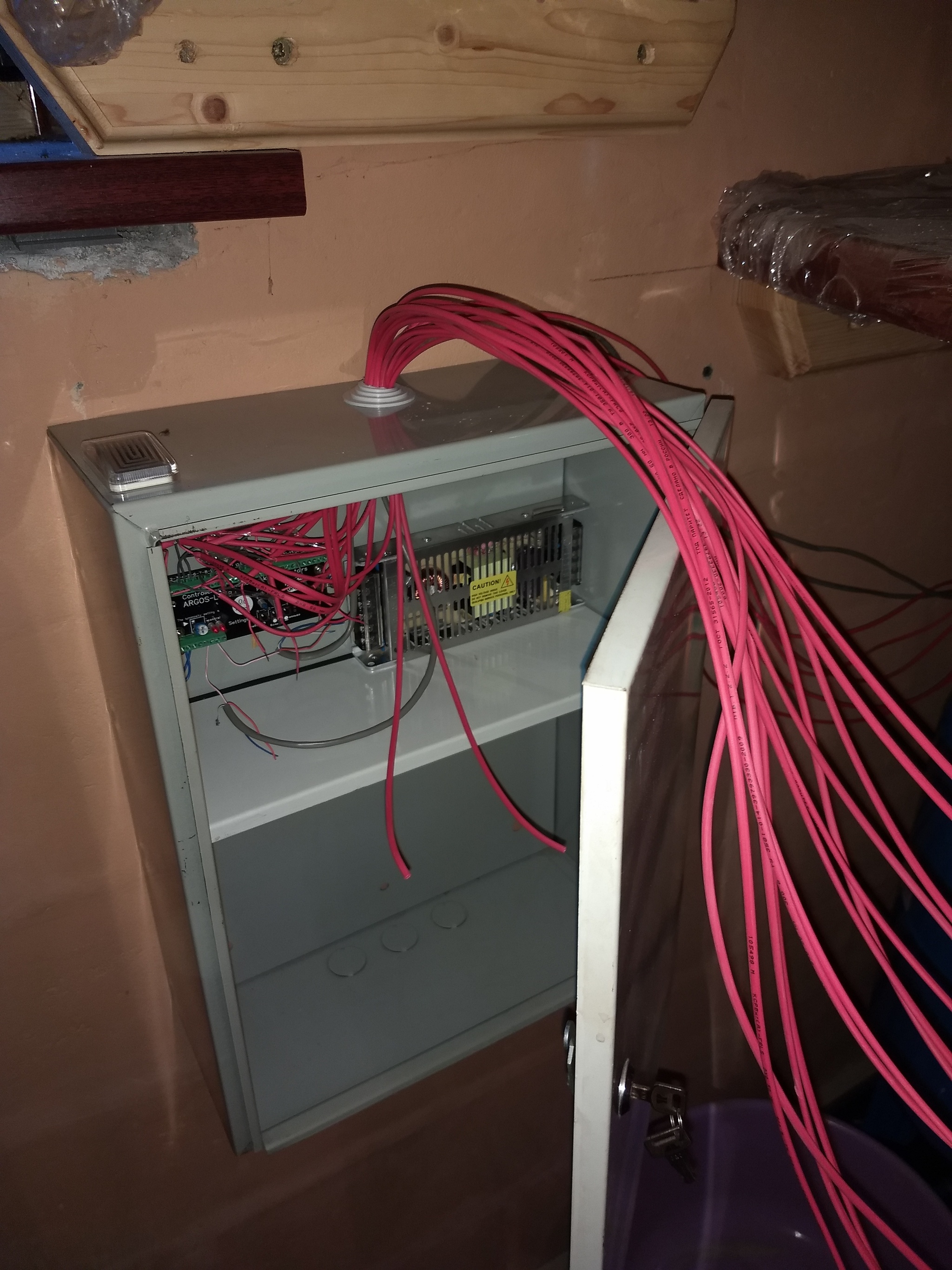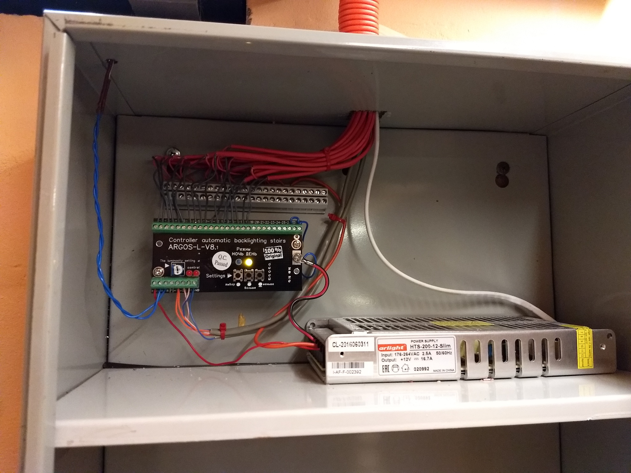 Сам процесс монтажа я не фотографировал, там особо нечего фотать. Выбираем место для контроллера - он должен быть где-то недалеко от лестницы и, по возможности, окна, чтобы не тащить датчик. Я разместил все это богатство в железном шкафчике, до самой "дальней" ступени около 4 м. Размещаем профиль с лентой нужной длины под срезом соответствующей ступени, припаиваем кабель и тянем его к контроллеру.
