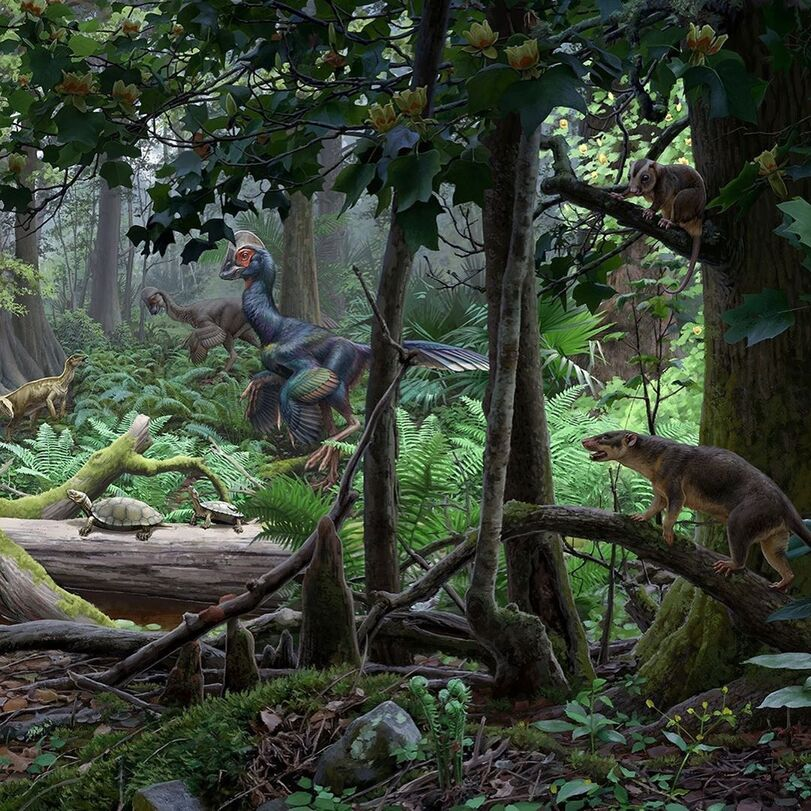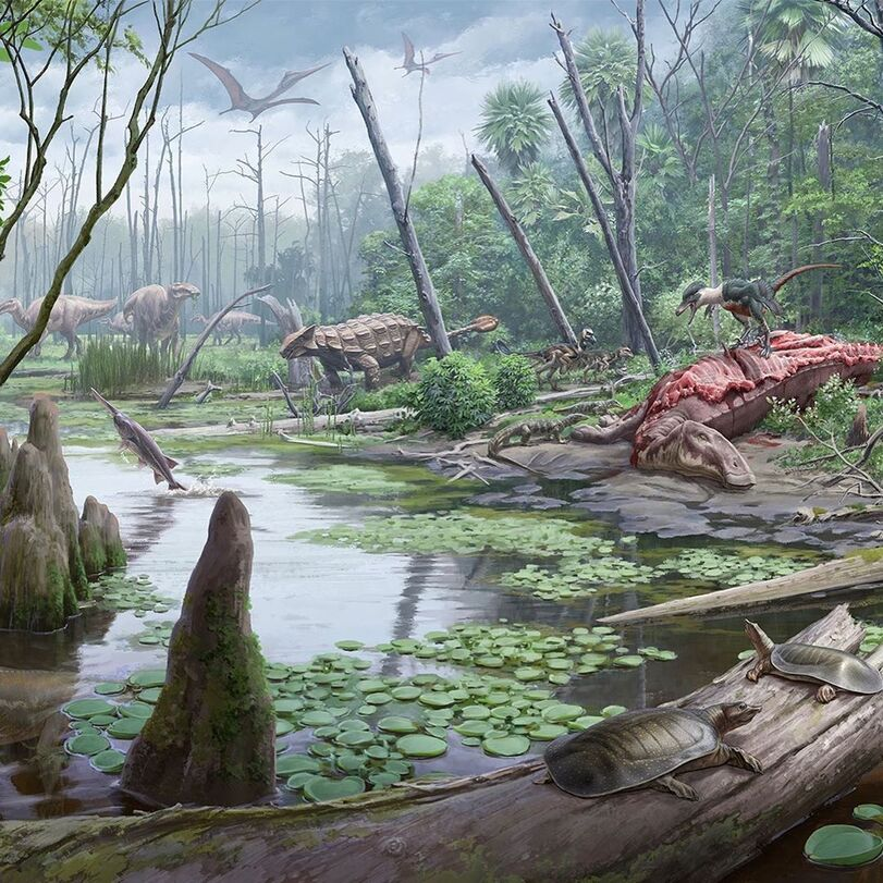 На переднем плане художник изобразил плотоядную ящерицу Palaeosaniwa, змею Ceriberophis и небольшую ящерицу Obamadon, которая следит за парочкой убегающих эдмонтозаврят. На заднем плане - тираннозавр и трицератопсы. Ну и метеорит, куда же без него на артах границы мел-палеогена