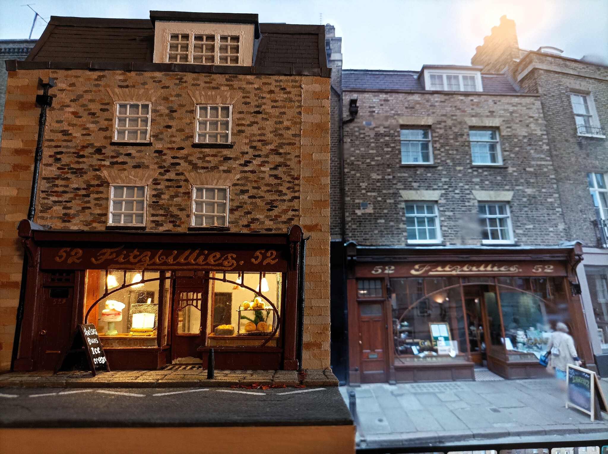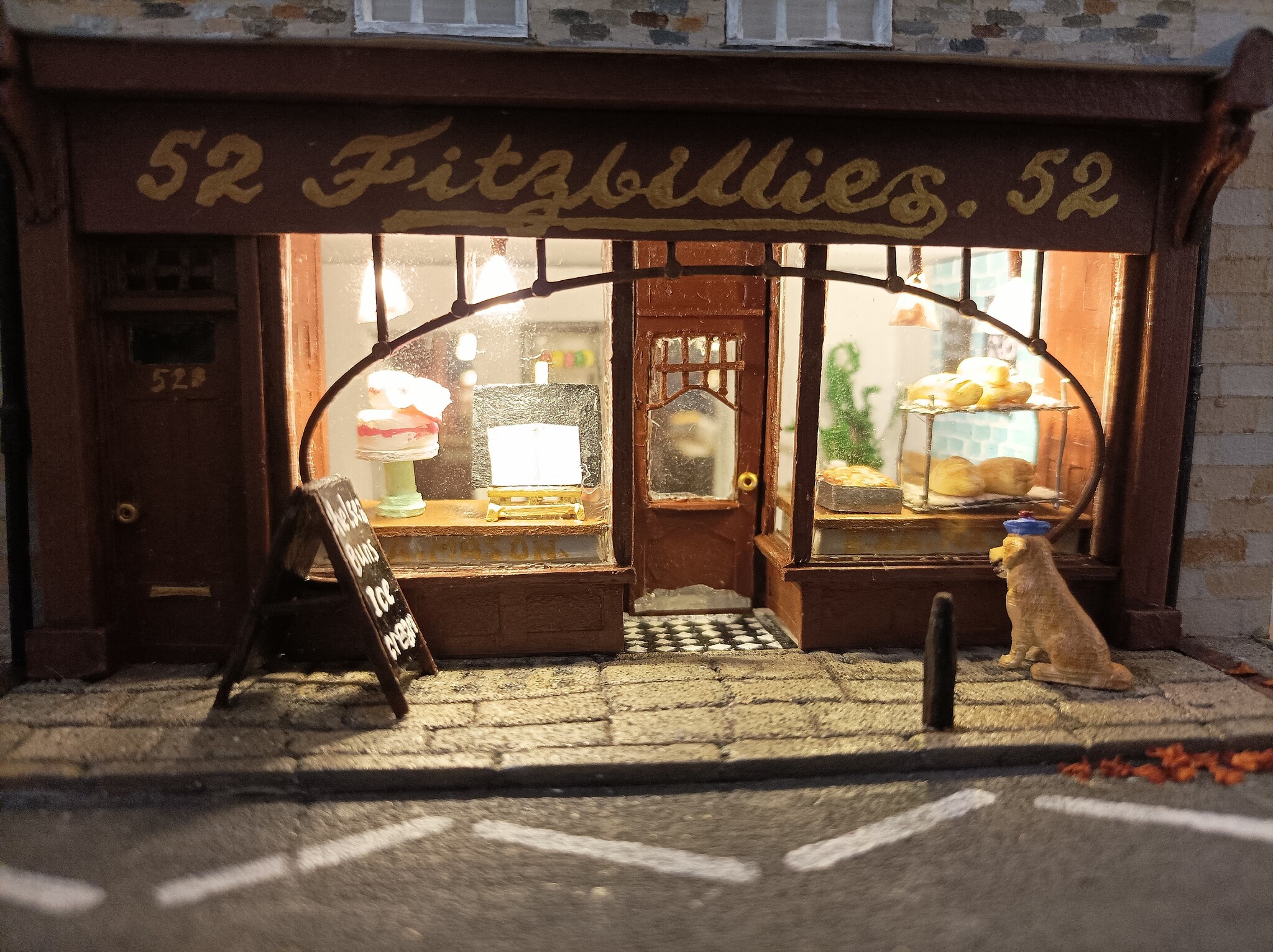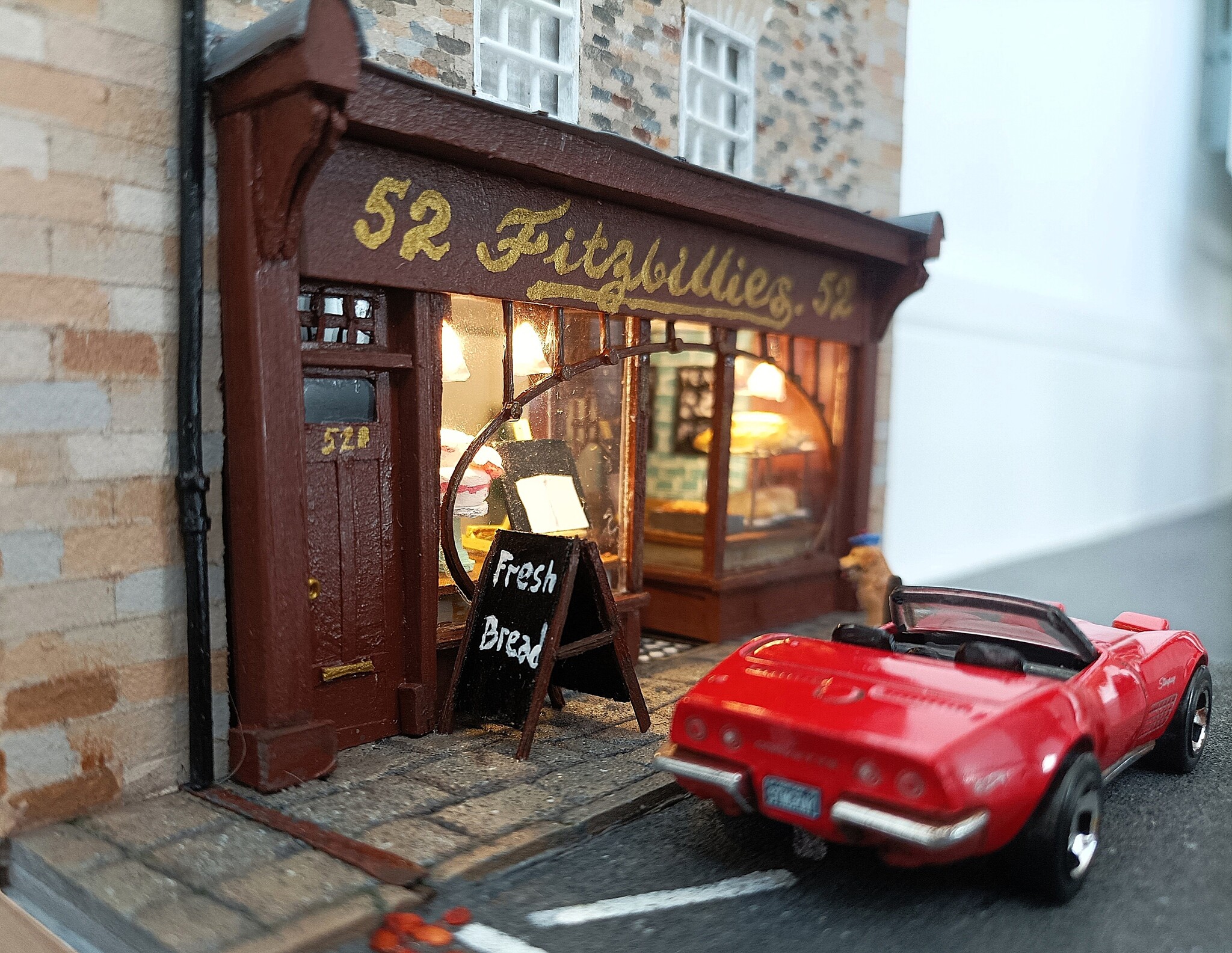 В этом году начала делать диорамы, и это моя вторая диорама (и первая, которую не стыдно здесь показать :) ). Масштаб 1:64 был выбран по модели автомобиля, обмерила реальное кафе по Google Maps и старалась придерживаться всех соотношений и размеров.