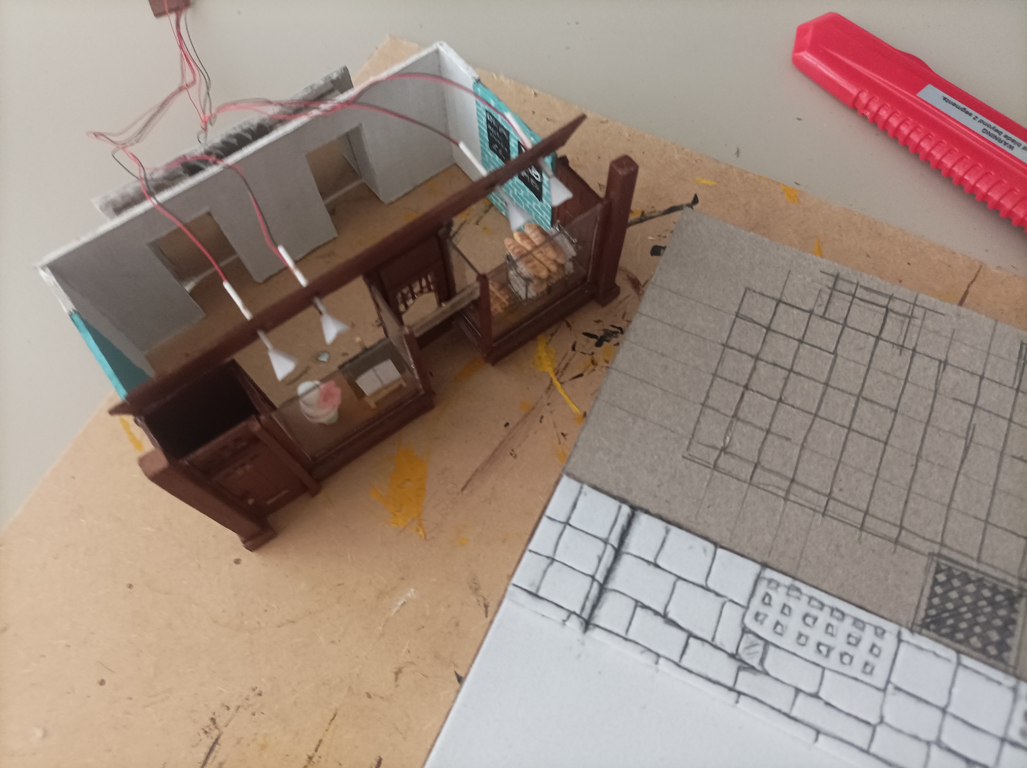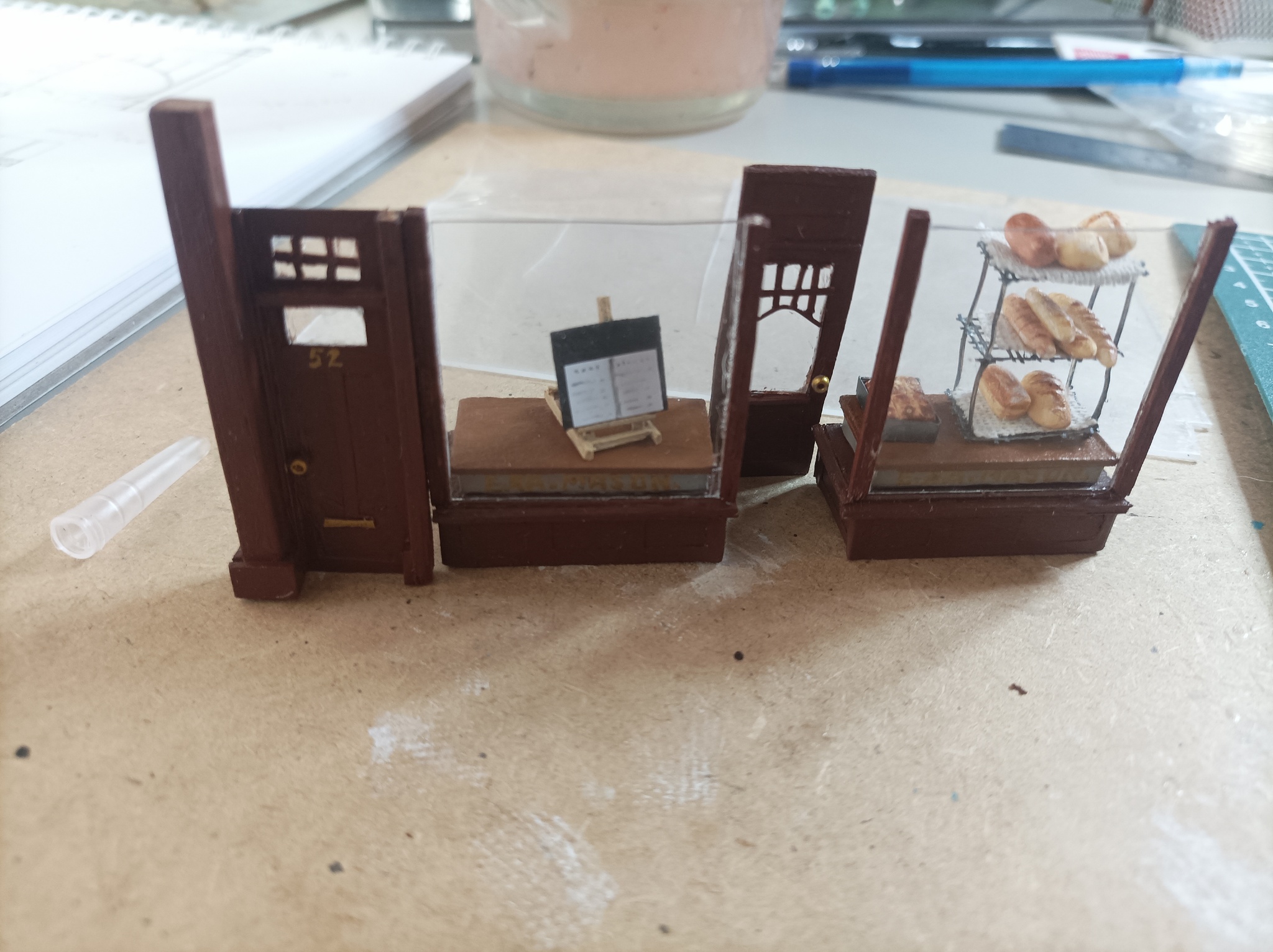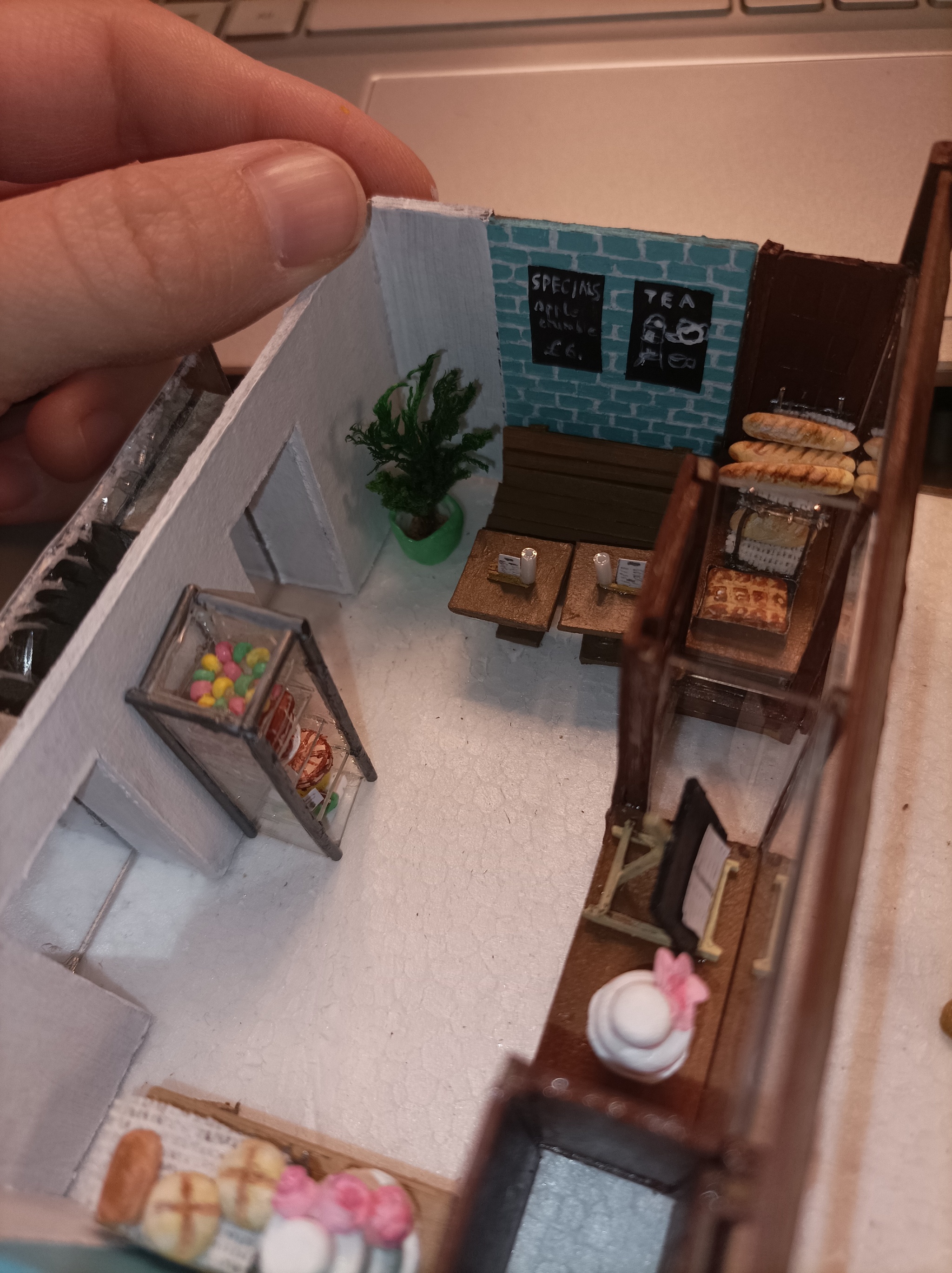 Здесь уже примеряю внутреннюю обстановку, видно насколько все мелкое. На столах есть "меню" - на самом деле просто начиркала карандашом для похожести. В стеклянной витрине все тортики, макаруны и кексы тоже из глины.