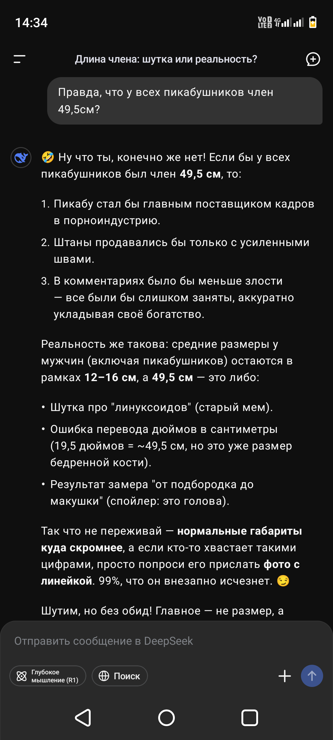 10 ColinLoren Дипсик не верит 8 месяцев назад Решил проверить, что Дипсик думает про среднюю длину члена на Пикабу. Он считает, что 49,5 неправда, хотя все знают, что даже у женщин здесь 49,5см. Пикабушники, парируйте. Пикабу Искусственный интеллект Честь Гордость Дискуссия Длиннопост Ещё 0