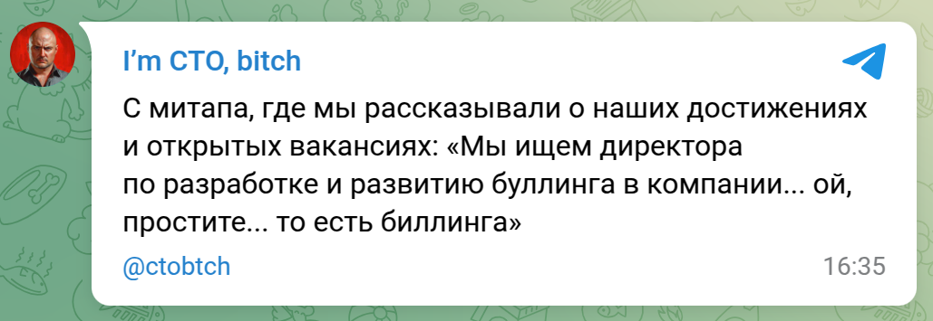 13 imctobitch Норм автор Юмор Директор по развитию буллинга Серия I'm CTO, bitch 11 месяцев назад 😡 Телеграм-канал [моё] I`m CTO bitch Травля Юмор Оговорки Митап Директор Найм 1 Ещё 0