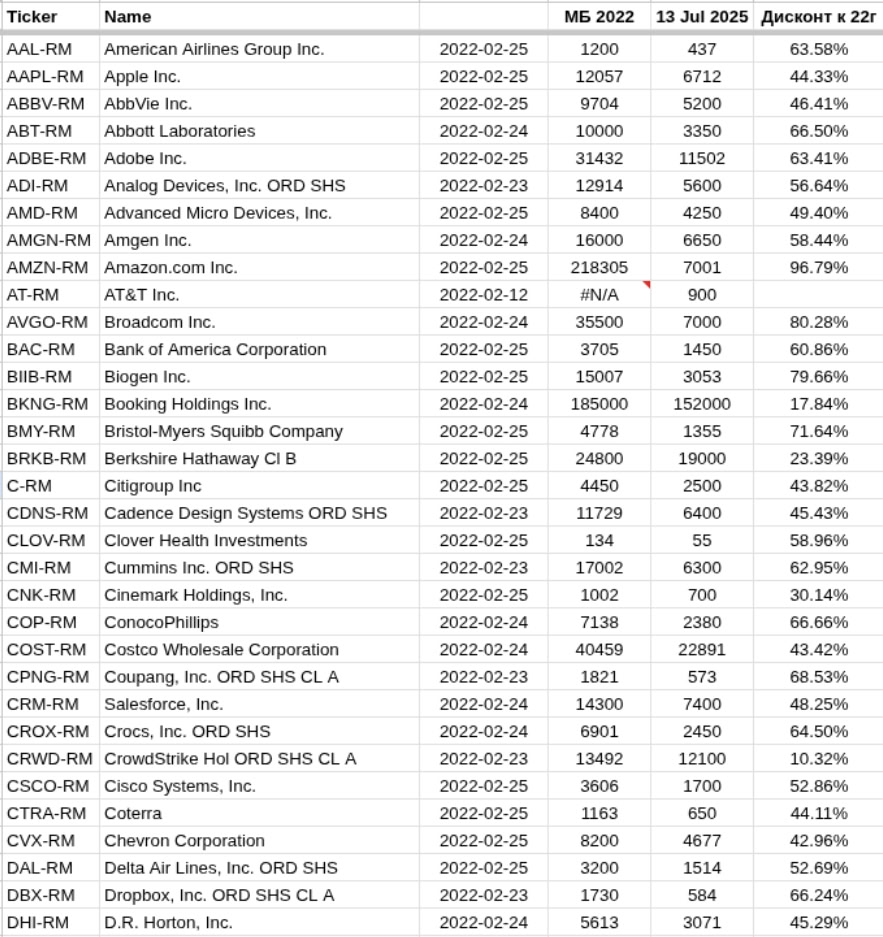 Таблица дорабатывается, сейчас дисконты считаются к цене на Мосбирже на дату когда есть последняя известная продажа (колонка МБ 2022), дата указана в колонке перед ценой.