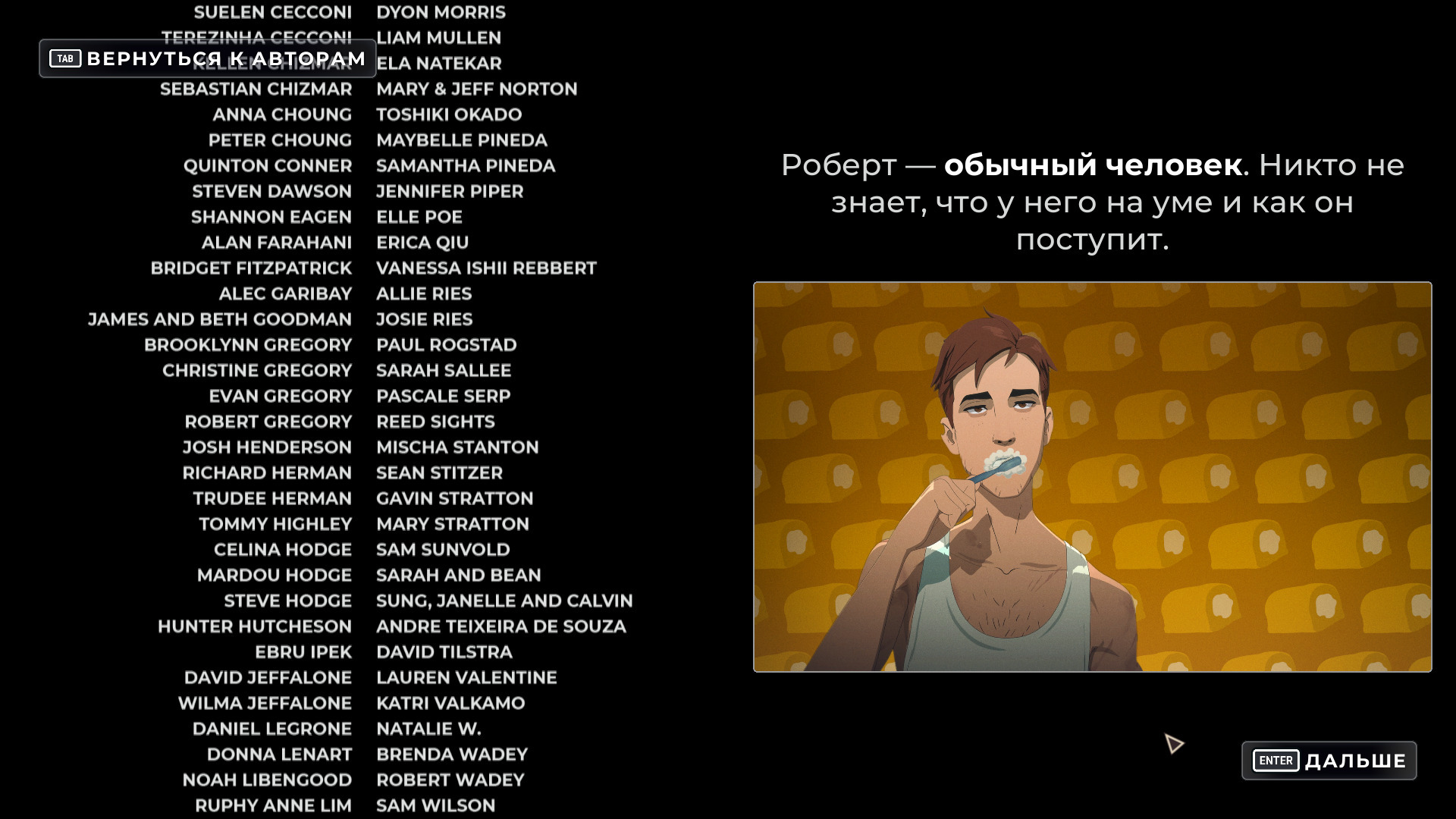 Прежде всего хочу сказать спасибо голосу Аарона Пола и разработчикам, которые выбрали конкретного актёра. Я шут знает какие смыслы имели ввиду те, кто мог бы ткнуть в другое имя мужской озвучки или дело было только в его согласии на скромные условия контракта. Но львиная доля значимых подтекстом мне чудится именно благодаря озвучке Роберта.
