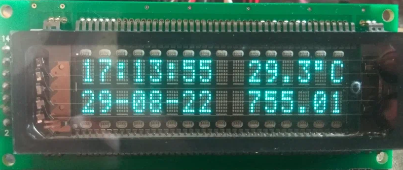 Дисплей VDF1602 (16T202DA1E) выполнен на базе вакуумно-люминесцентного индикатора, который может отображать ASCII символы в 2 строки (16 знаков в 1 строке) каждый символ в виде матрицы 5х7 пикселей.