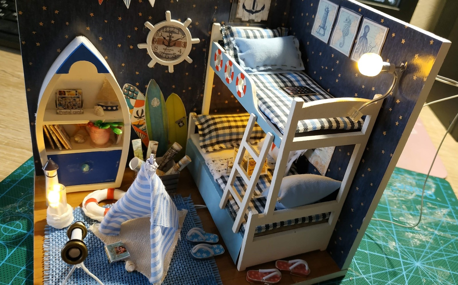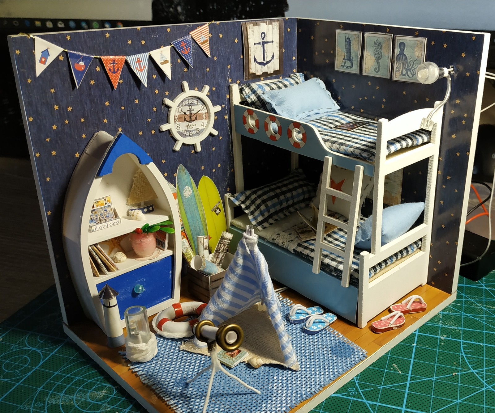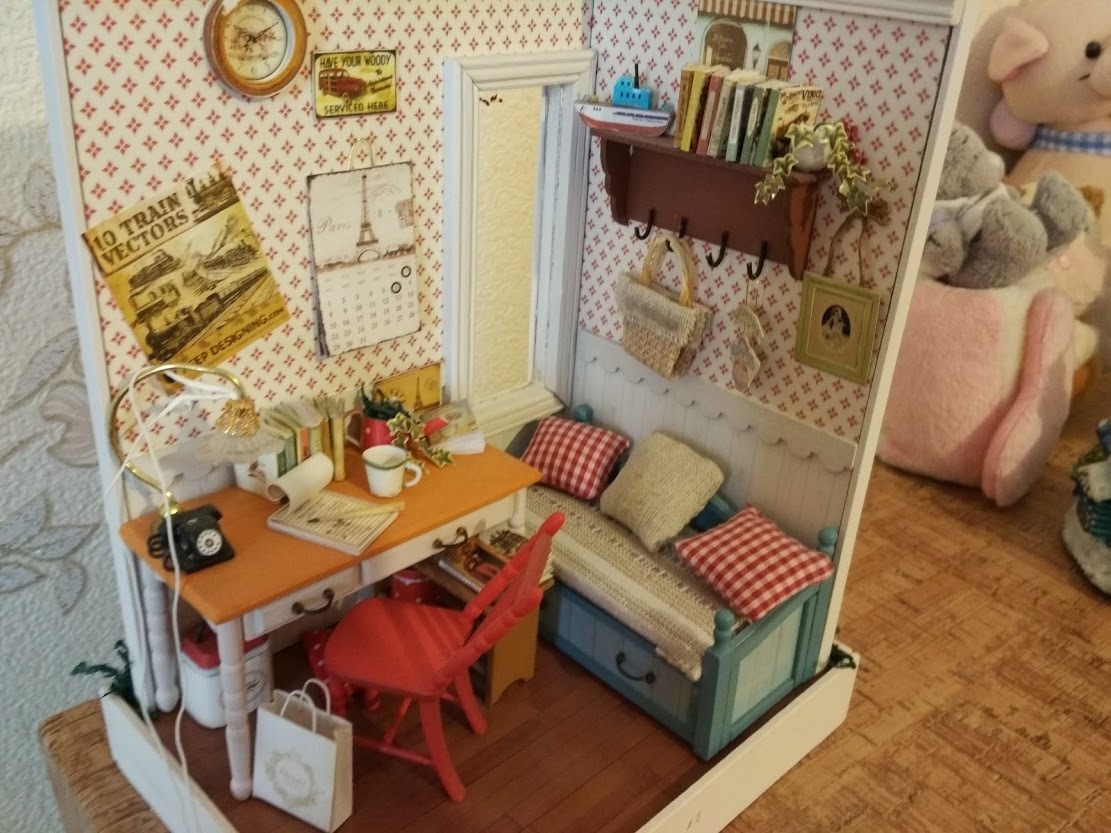 Сама сложность была конечно в мелких деталях, например миллиметровая этикетка на бусинку, но и так же в склейке стен и полов. После обоев и ПВА деревяшки кукожились и не хотели клеяться ровно, потому некоторые мои стены с зазорами :)