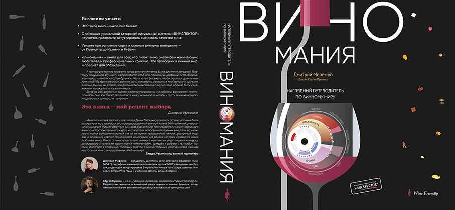 Над книгой работали добрых полгода. Главная ее изюминка — изобретенный автором (и визуально доработанный и докрученный нами вместе) Винспектор — лаконичная с виду, но очень емкая по информативности комплексная диаграмма характеристик вина. И мне очень приятно, хотя бы и в малом, но стать соавтором данного труда, несущего в себе богатый многолетний опыт Дмитрия. Наглядные схемы виноделия, описание важнейших терминов и обозначений, таблицы лучших производителей, гастрономия по сортам, карты регионов и многое-многое другое, чтобы помочь разобраться читателю в вине на качественно ином уровне. Судя по продажам, у нас это получилось.
