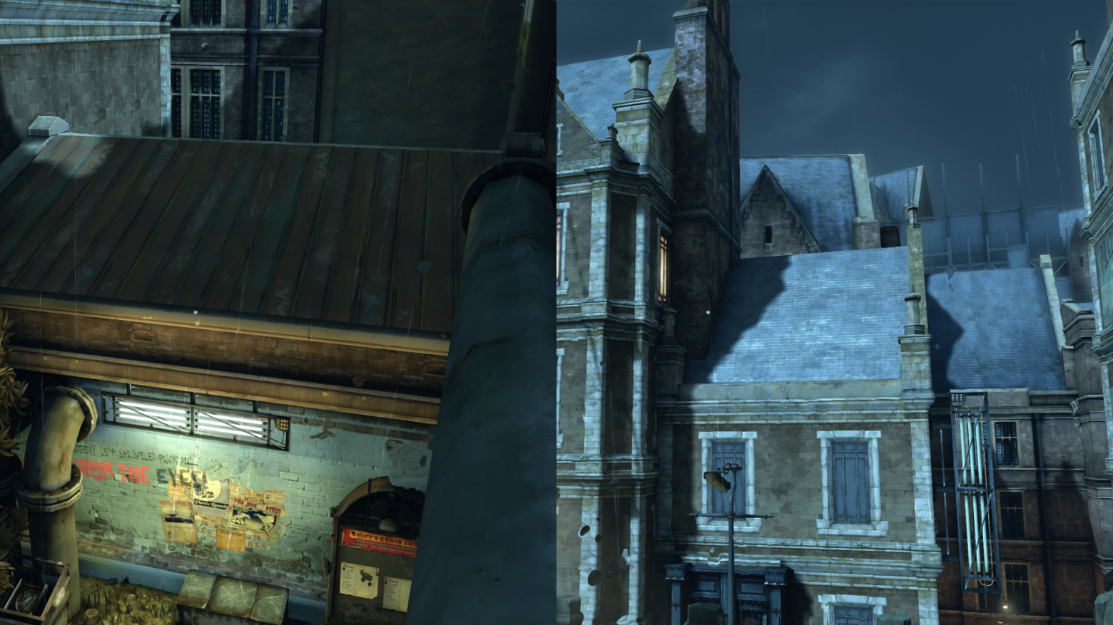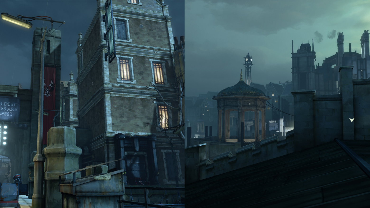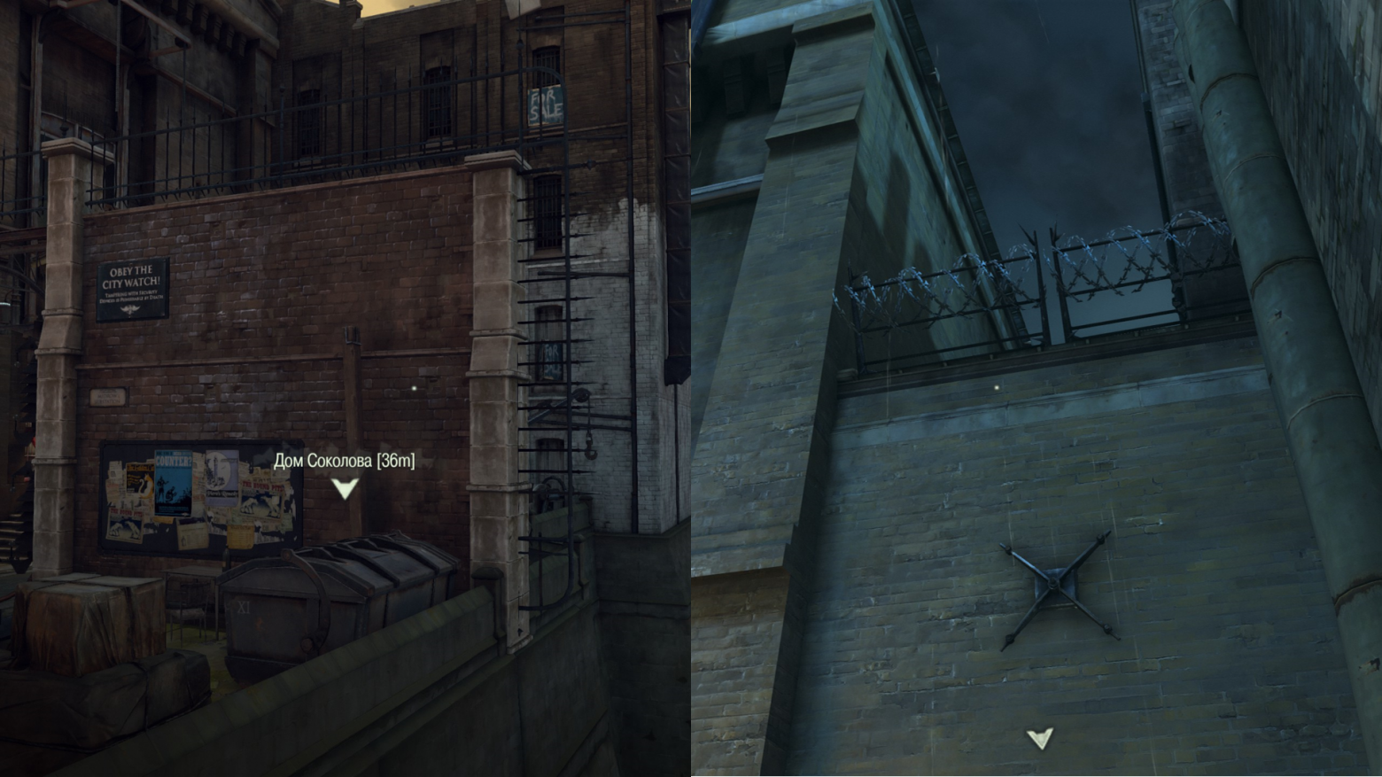 В игре Dishonored разработчики часто используют большое количество ящиков или объектов прямоугольной формы для создания ступенчатых поверхностей. Это позволяет стимулировать глаз игрока к движению по этим поверхностям. Такой прием широко применяется в Dishonored.