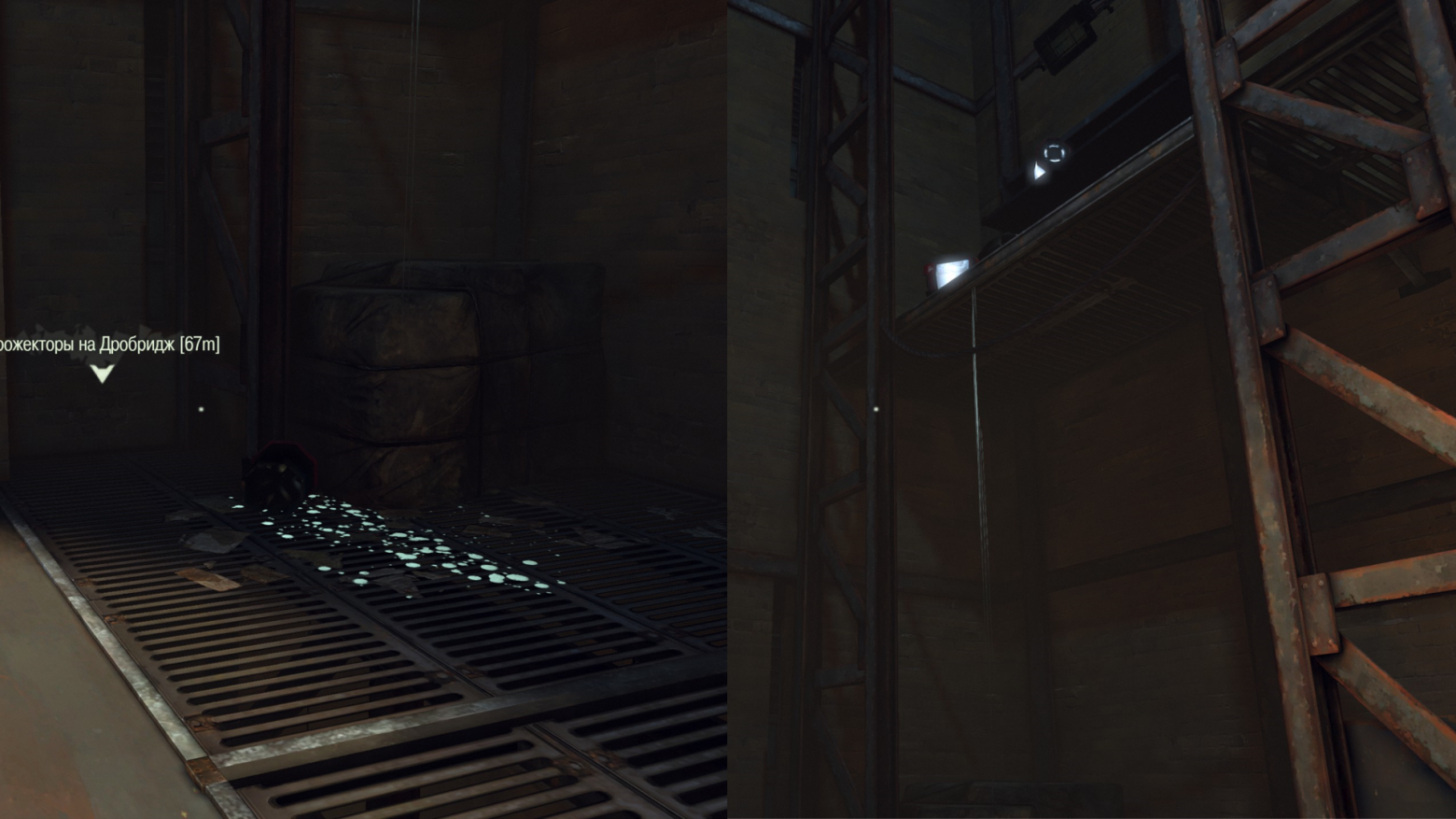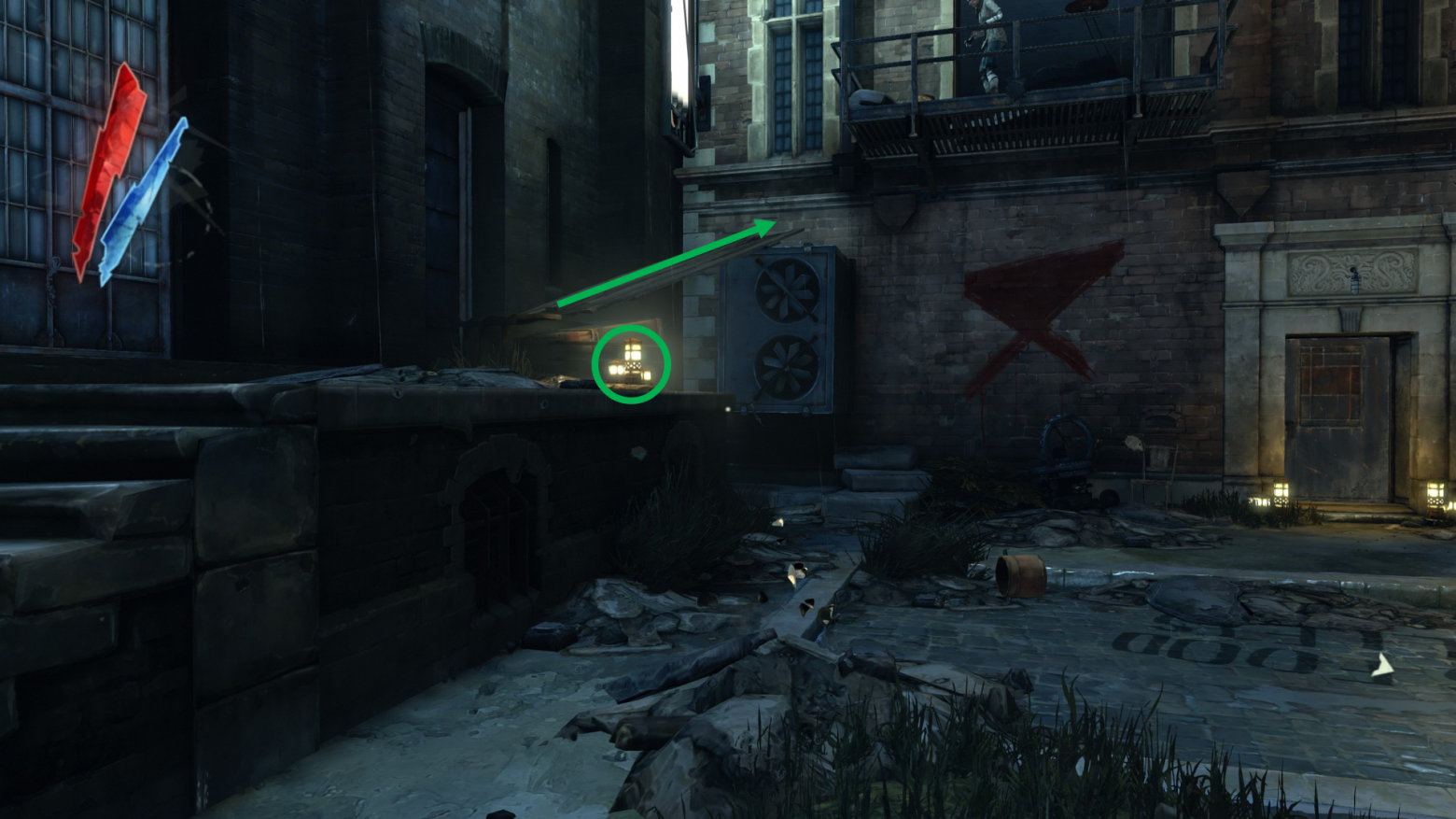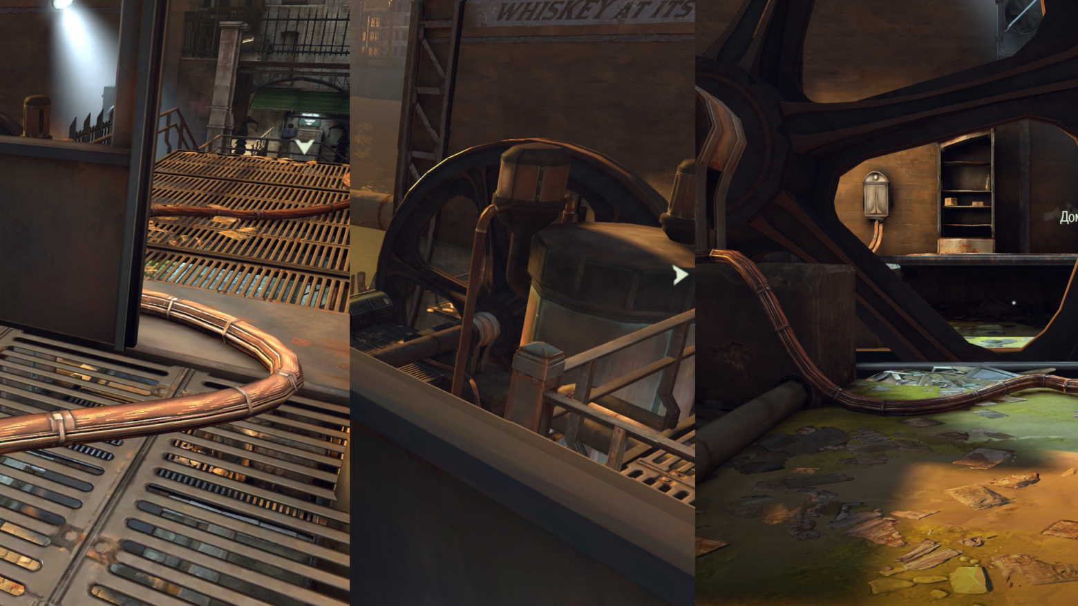 В игре Dishonored разработчики часто используют большое количество ящиков или объектов прямоугольной формы для создания ступенчатых поверхностей. Это позволяет стимулировать глаз игрока к движению по этим поверхностям. Такой прием широко применяется в Dishonored.