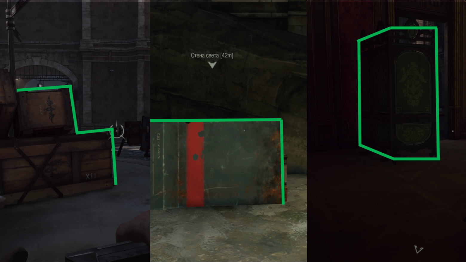 Конечно, главной особенностью Dishonored является его многоуровневость локаций. Это позволяет быть игроку скрытным при прохождении всей игры, быть в той зоне уровня, которая находится в невидении врагов. В игре можно найти различные укрытия, которые предоставляют возможность наблюдать за противником. Некоторые укрытия не обеспечивают полную невидимость игрока (Рис. 1), но расширяют область обзора для слежения за врагом. Есть также металлические пластины, которые скрывают игрока в приседе (Рис. 2). Кроме того, в игре можно встретить укрытия, полностью скрывающие игрока в любом положении (Рис. 3).