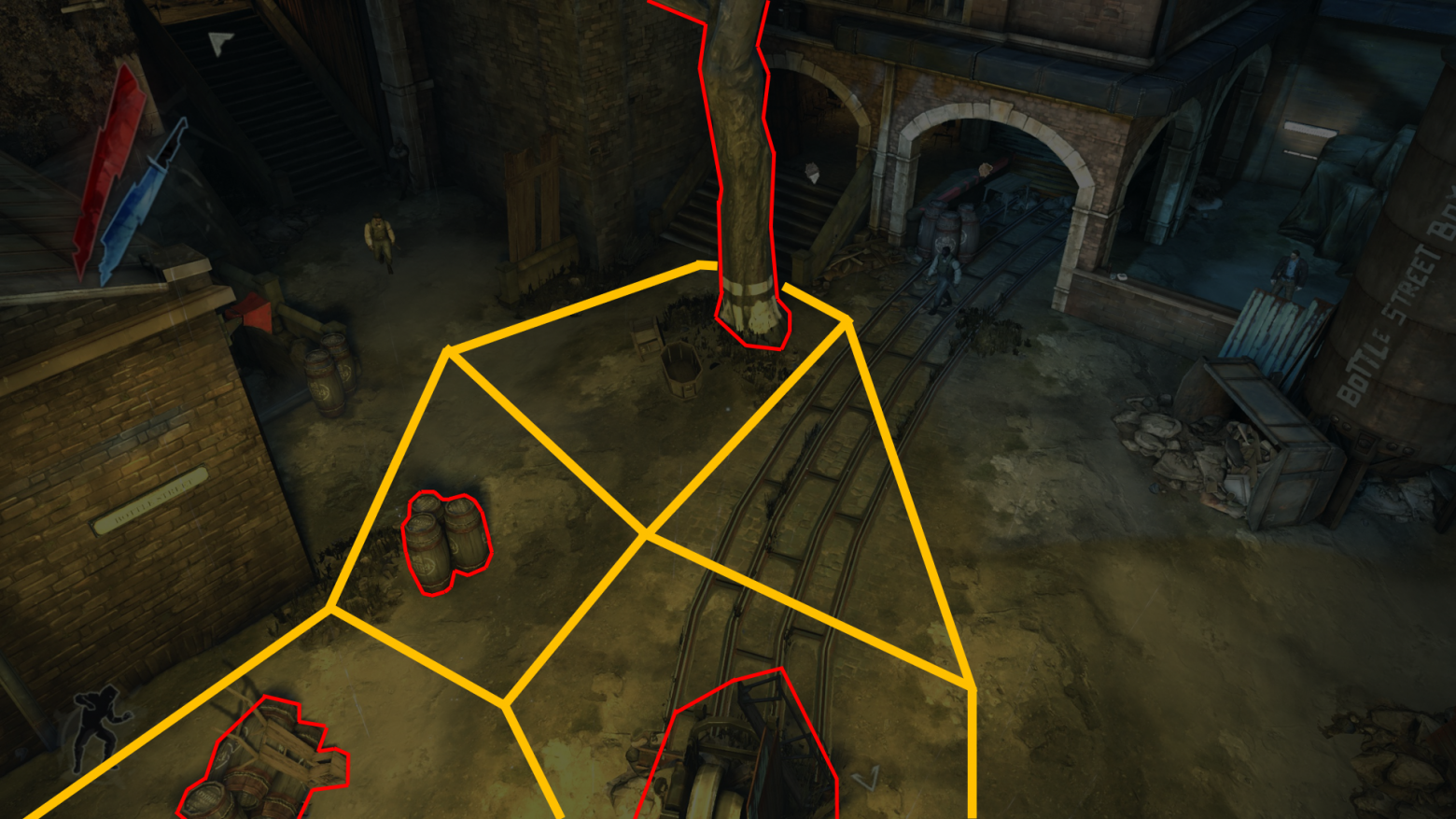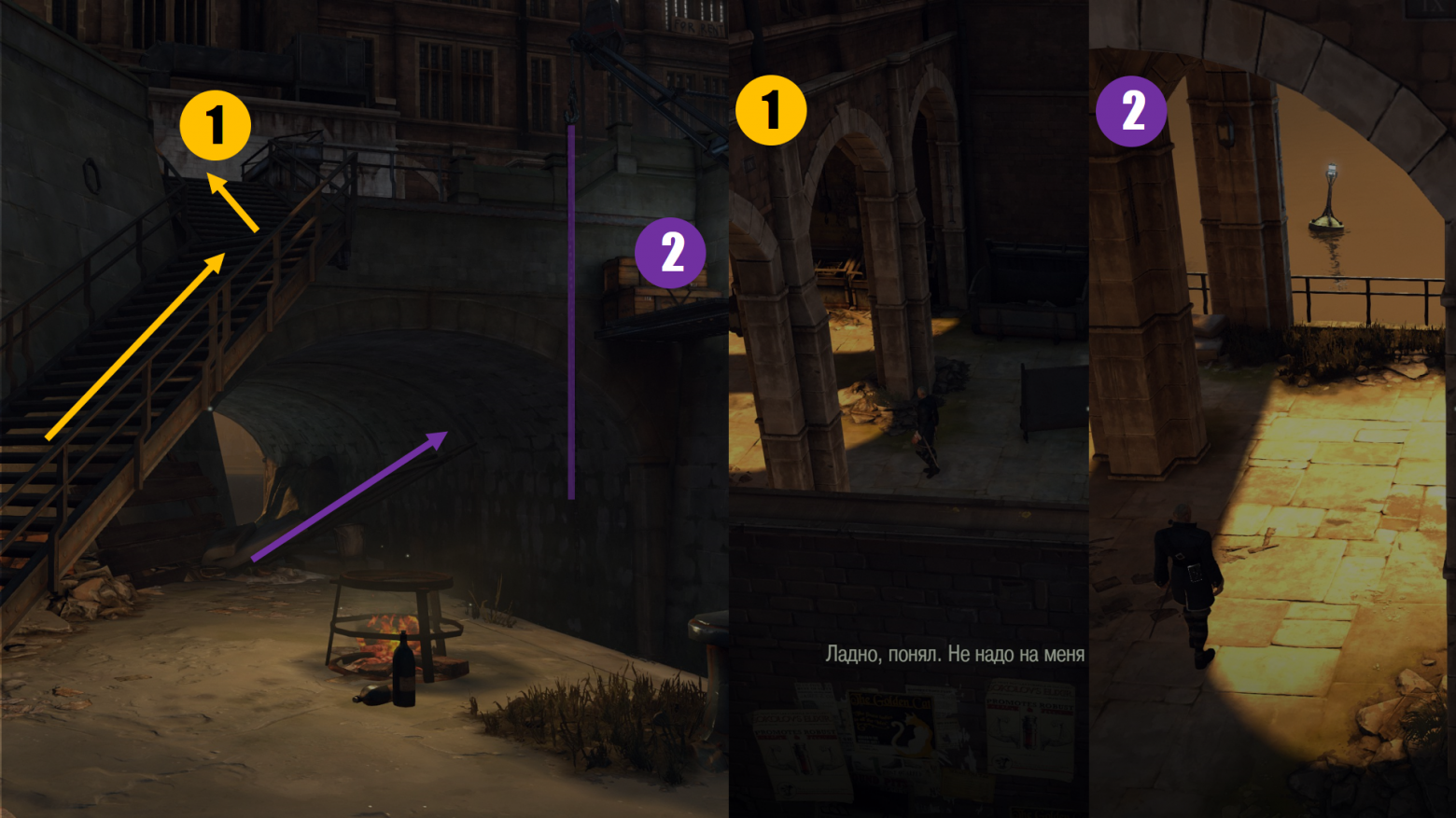 Dishonored может все также удивить и картой возможностей для игрока. В следующую локацию всегда можно пройти как минимум двумя способами и спроектировано для любого стиля прохождения. Например, на следующем рисунке можно заметить два явных способа пройти в следующее пространство: это лестница (желтый цвет), которая приведет в конечном итоге в место, где можно увидеть выход с локации и противника или это цепь (сиреневый цвет), которая позволяет подойти уже к другому месту, позволяющее точно также увидеть все тех же противника и выход с локации. Любой способ прохождения ведет игрока в одну и ту же точку (выход с локации, здание), что дает возможность человеку лучше создать карту местности, где именно он находится. Если бы пути прохождения в следующую локацию отличались, то и определить свое местоположение было бы куда труднее.