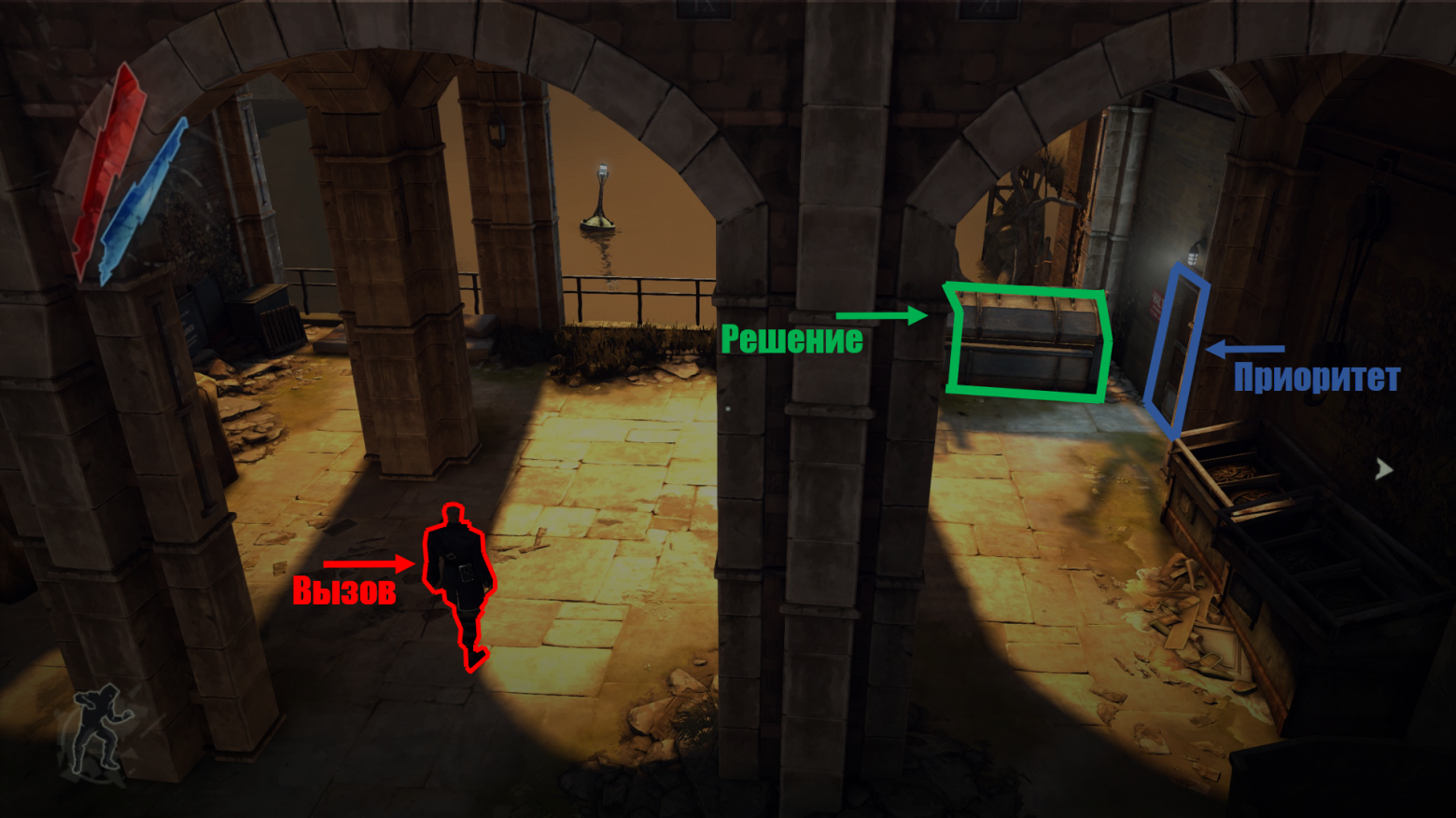 Еще один из интересных моментов построения решения и приоритета. Например, на этой же локации, когда игрок устраняет противника, то он захочет, скорее всего, спрятать труп. Один из способов – это контейнер. Приоритет и решение построены таким образом, что при скрытии трупа в контейнере игрок сразу будет видеть перед собой выход с локации, что позволяет не делать лишних движений, а сразу двигаться в направлении двери.