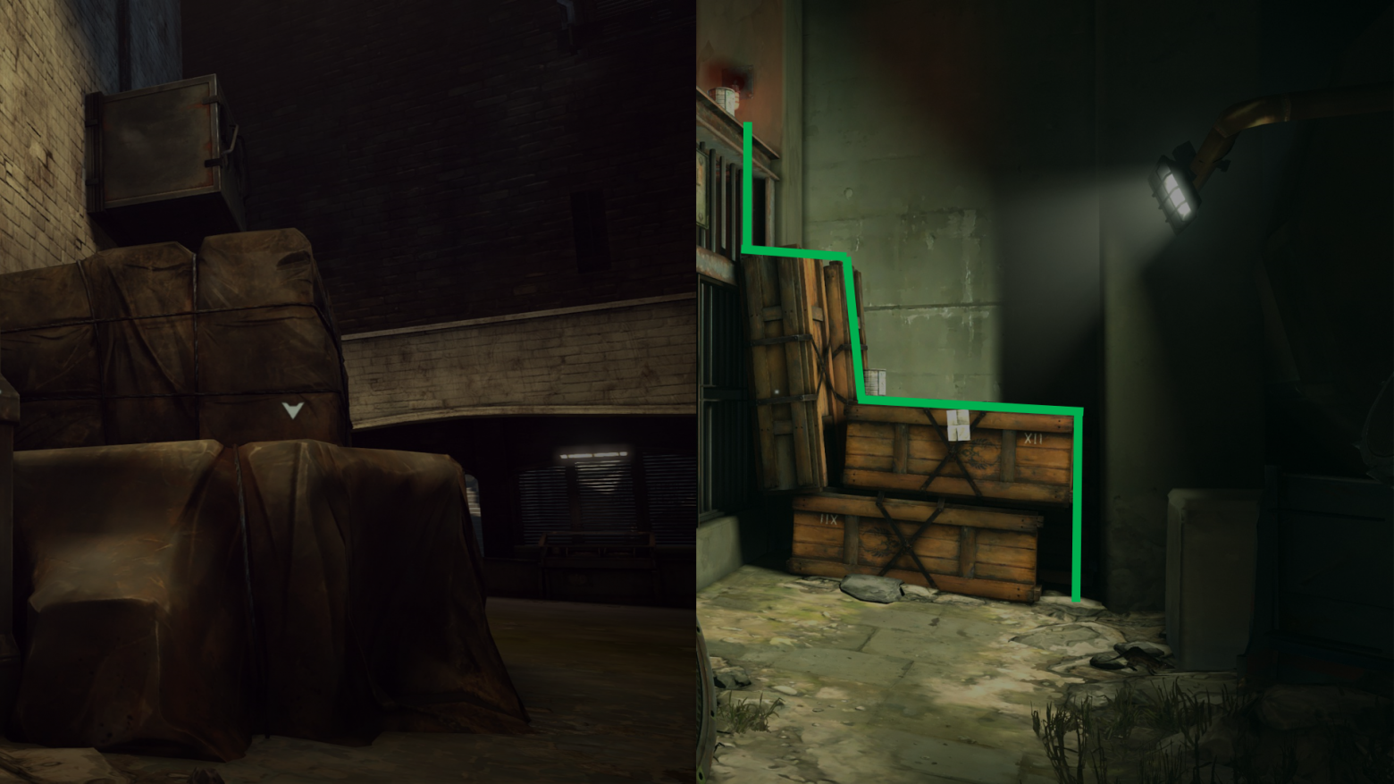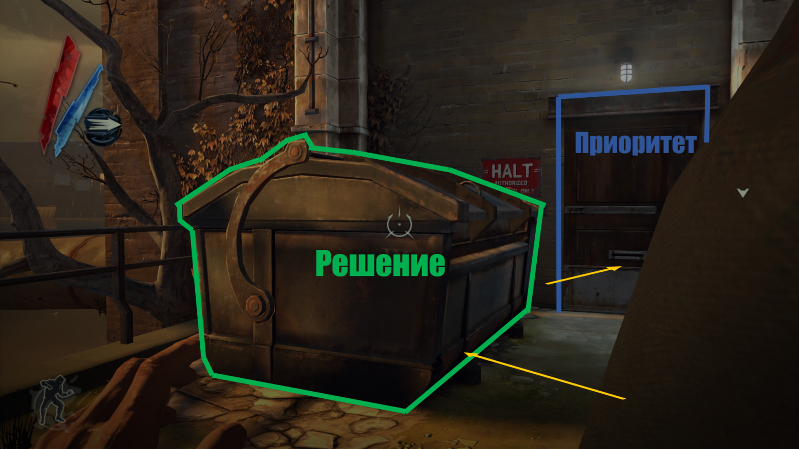 Не редко в игре можно встретить локации, которые построены таким образом, что игроку всегда сразу видны вызов (т.е. враг), решение (способы устранения), приоритет (выход из локации). Например, на следующем изображении можно заметить, что перед игроком есть вызов – стражник, перемещение которого можно легко запомнить. Решение – контейнер для мусора, где можно спрятать труп противника. Приоритет – дверь, ведущая в следующую локацию. Все делается таким образом, что все перечисленные элементы всегда были перед глазами игрока.