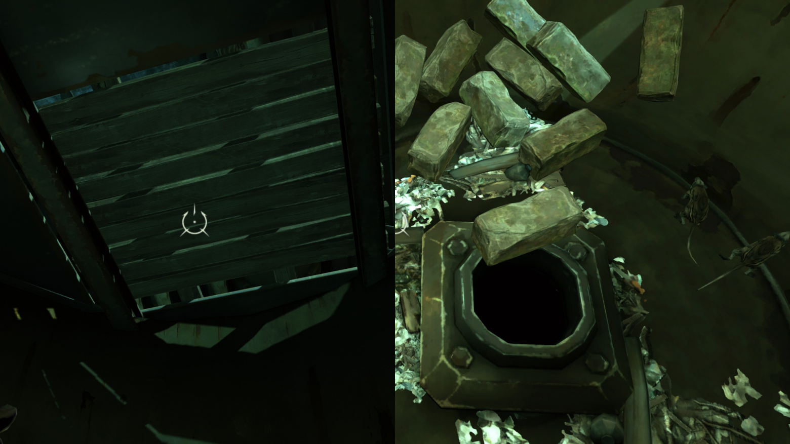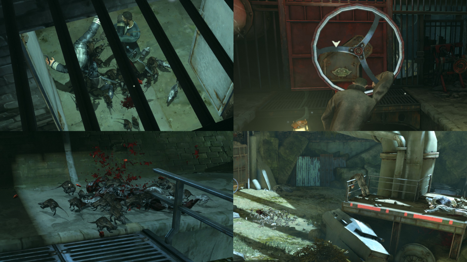 Разработчики Arkane Studios очень умело подходит к первой встрече игрока с крысами и обучает его нескольким механикам. Сначала игрок видит, что стаи крыс для него представляют серьезную опасность и могут легко его убить (Рис. 1), позже игрок может заметить, что эта же стая не обращает на него внимания, когда крысы поедают жертвы (Рис. 2), третьей фазой является обучение игрока возможности перетаскивать тела из одного места в другое, пока он этого не сделает, то не сможет пройти дальше. Четвертой финальной фазой становится тест на закрепление обученным механикам. Внимание игрока сначала акцентируют на трупах, которые падают сверху и крысах, которые заняты поеданием жертвы. Он может взобраться на поверхность, которая выделяется с помощью красных лент. Игроку надо взять один из трупов и бросить в пропасть, чтобы пройти дальше (Рис. 4).