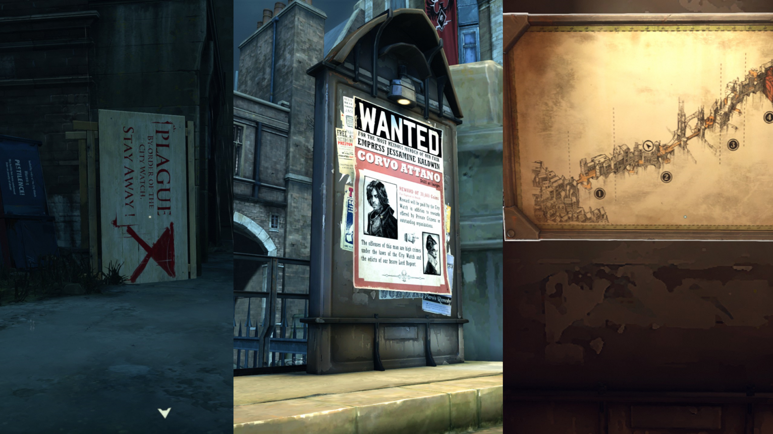 В Dishonored можно встретить большое количество говорящих деталей. Одними из самых интересных являются вывески о заражении крысиной чумой, что помогает понять, что рядом могут находиться крысы или зараженные (Рис. 1). Вывески о том, что разыскивается главный герой объясняет, почему стража постоянно враждебно настроена на игрока (Рис. 2). Вывеска с картой, которые можно встретить в городе, дает представление о прогрессе игрока (Рис. 3).