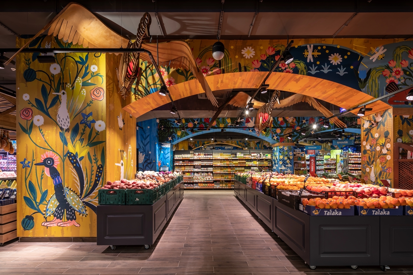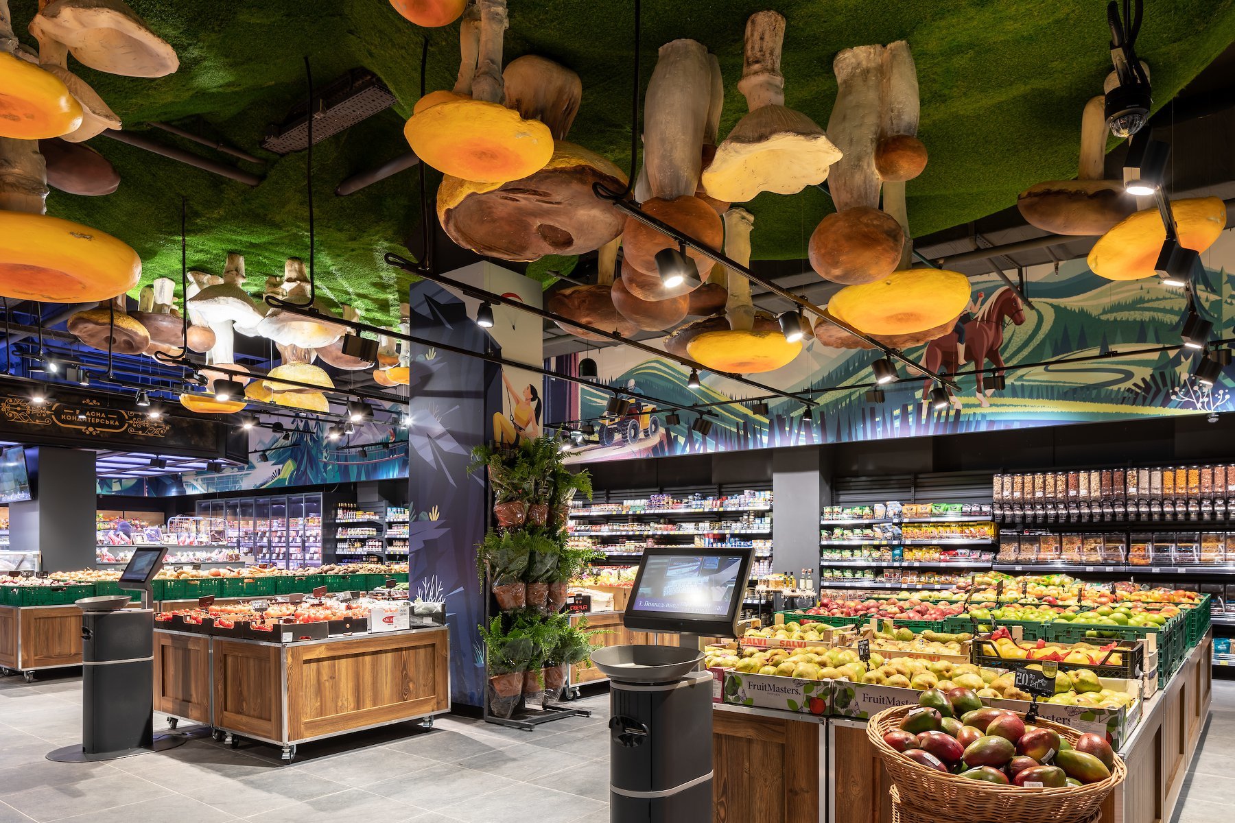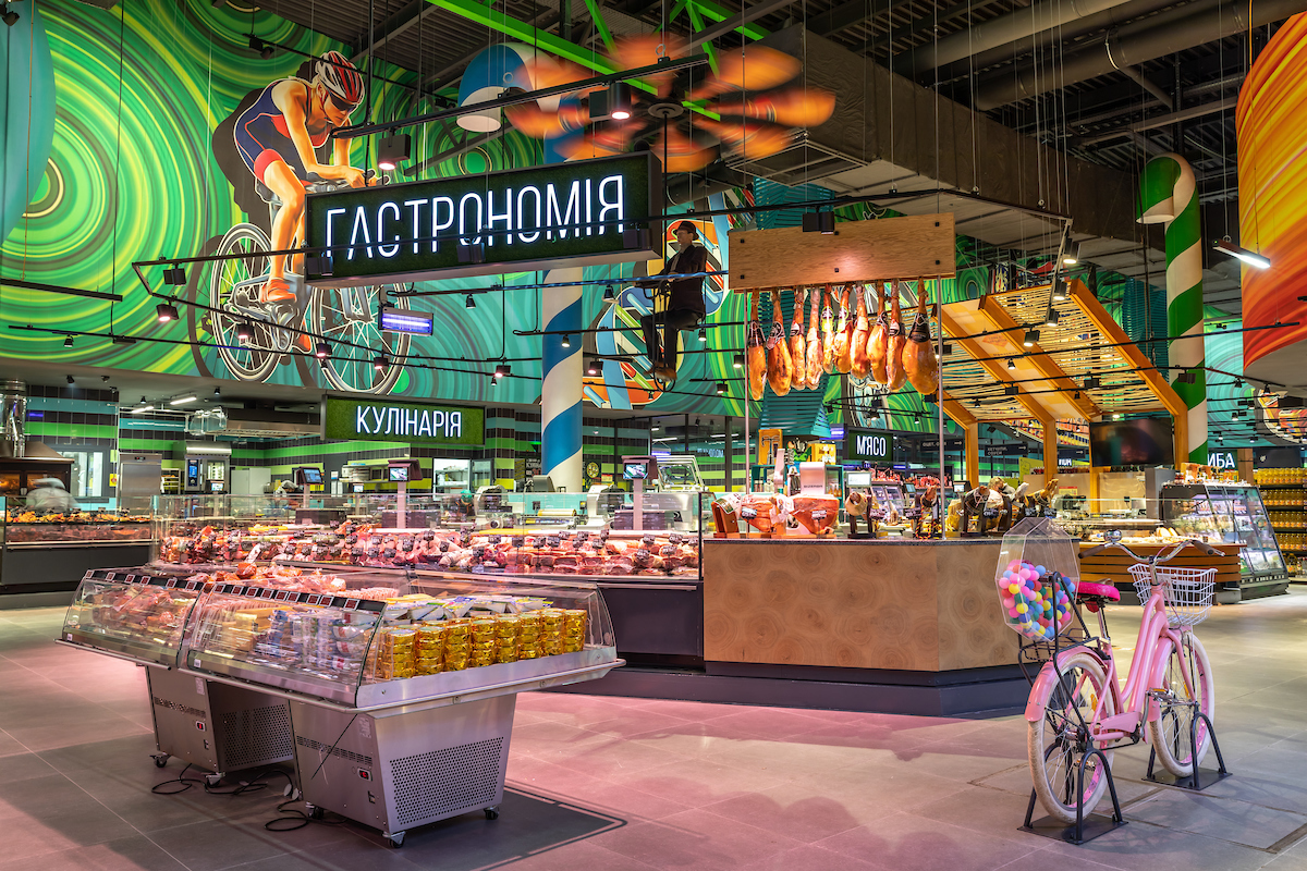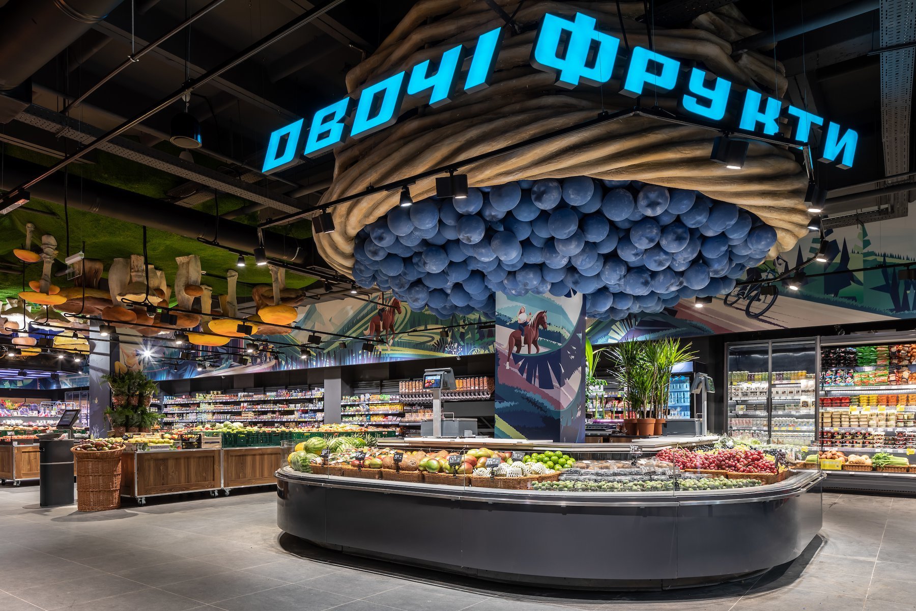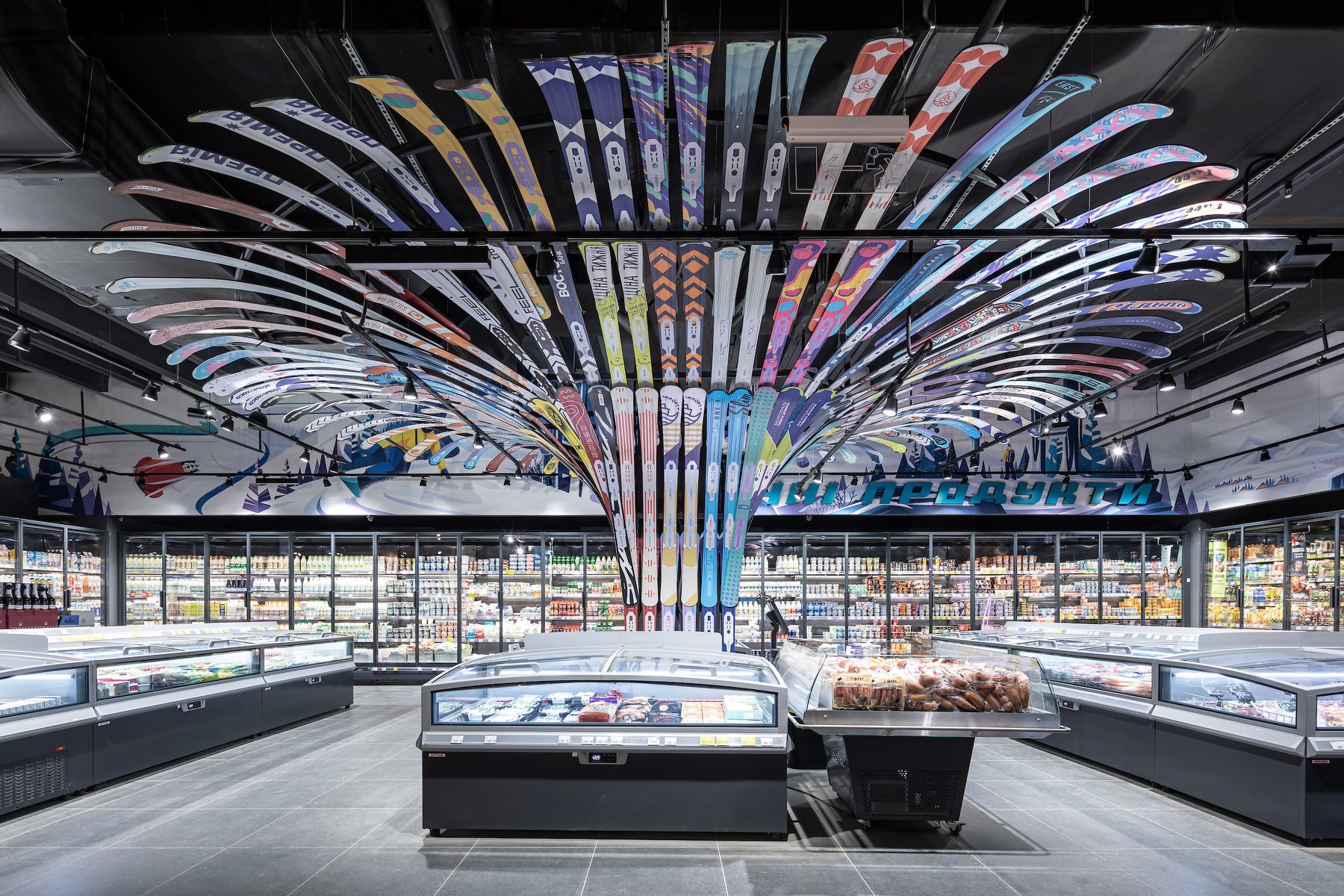 Супермаркет по мотивам отдыха в Карпатах. Здесь есть летние и зимние горные виды спорта и развлечения. Дельтаплан и лыжная маска, грибная поляна с огромной корзиной голубики. А на горе в гастрономии - скалолазы со снаряжением из колбасок и сыра.
