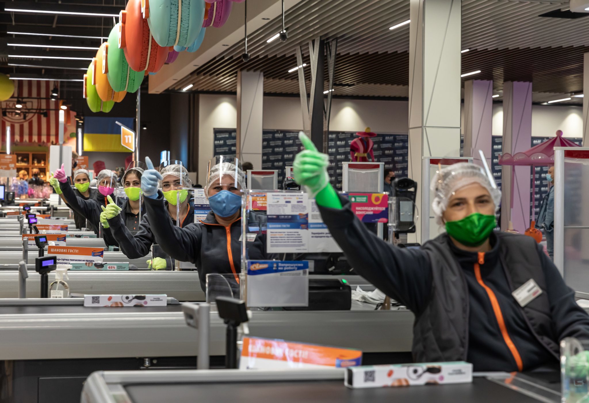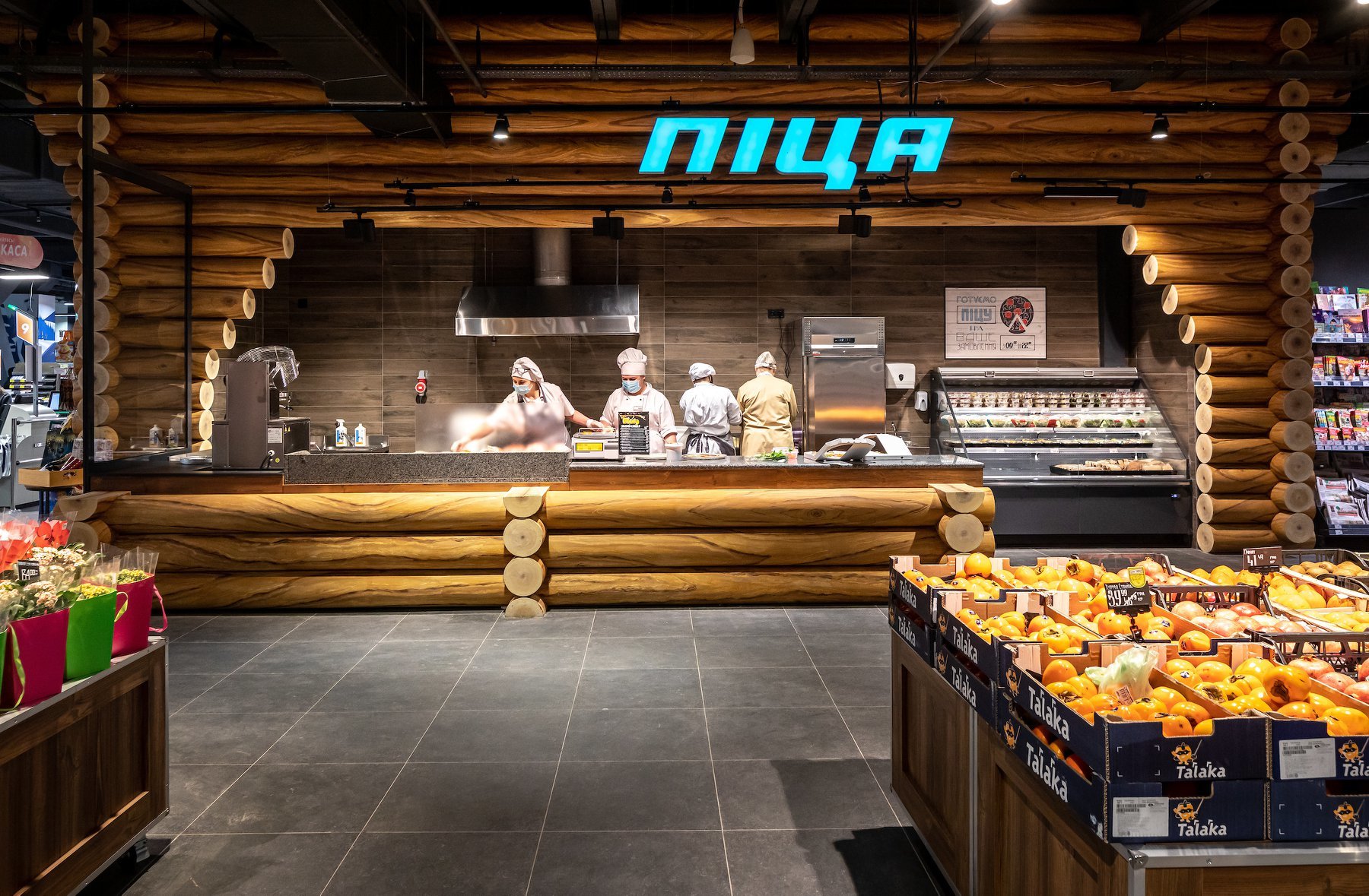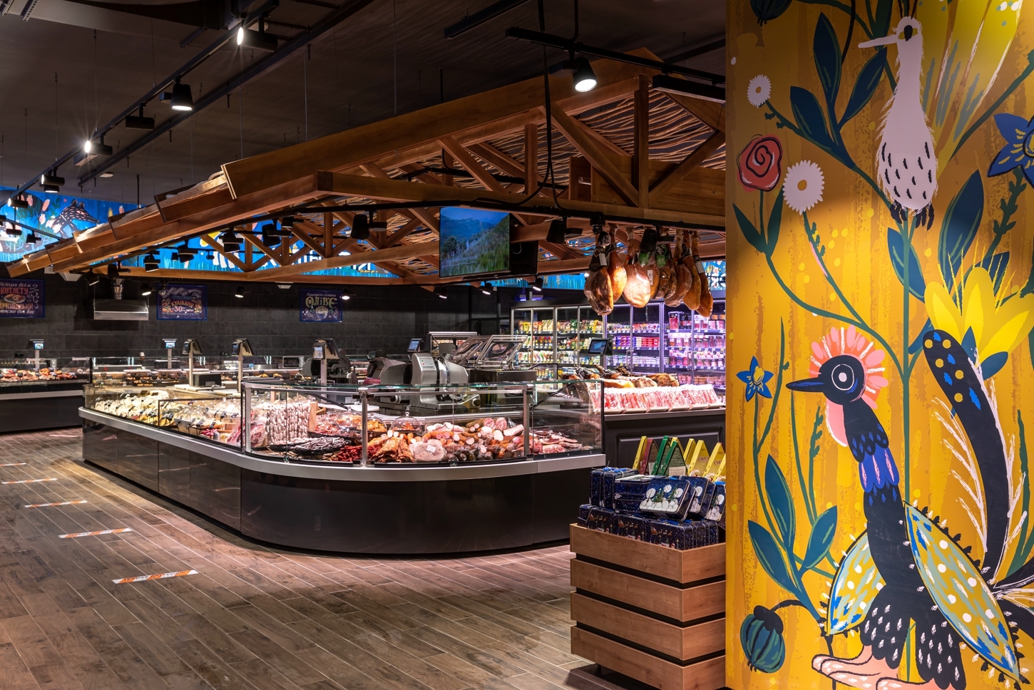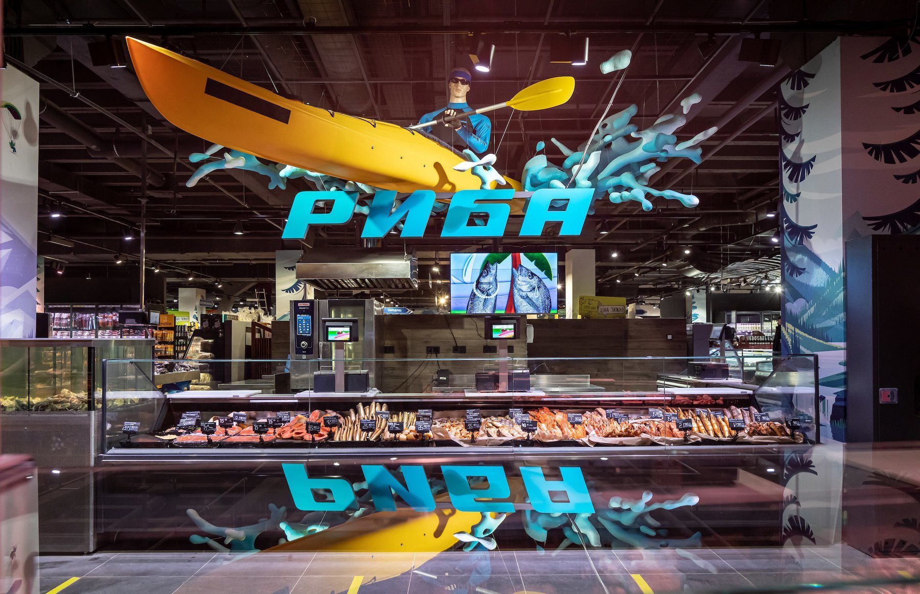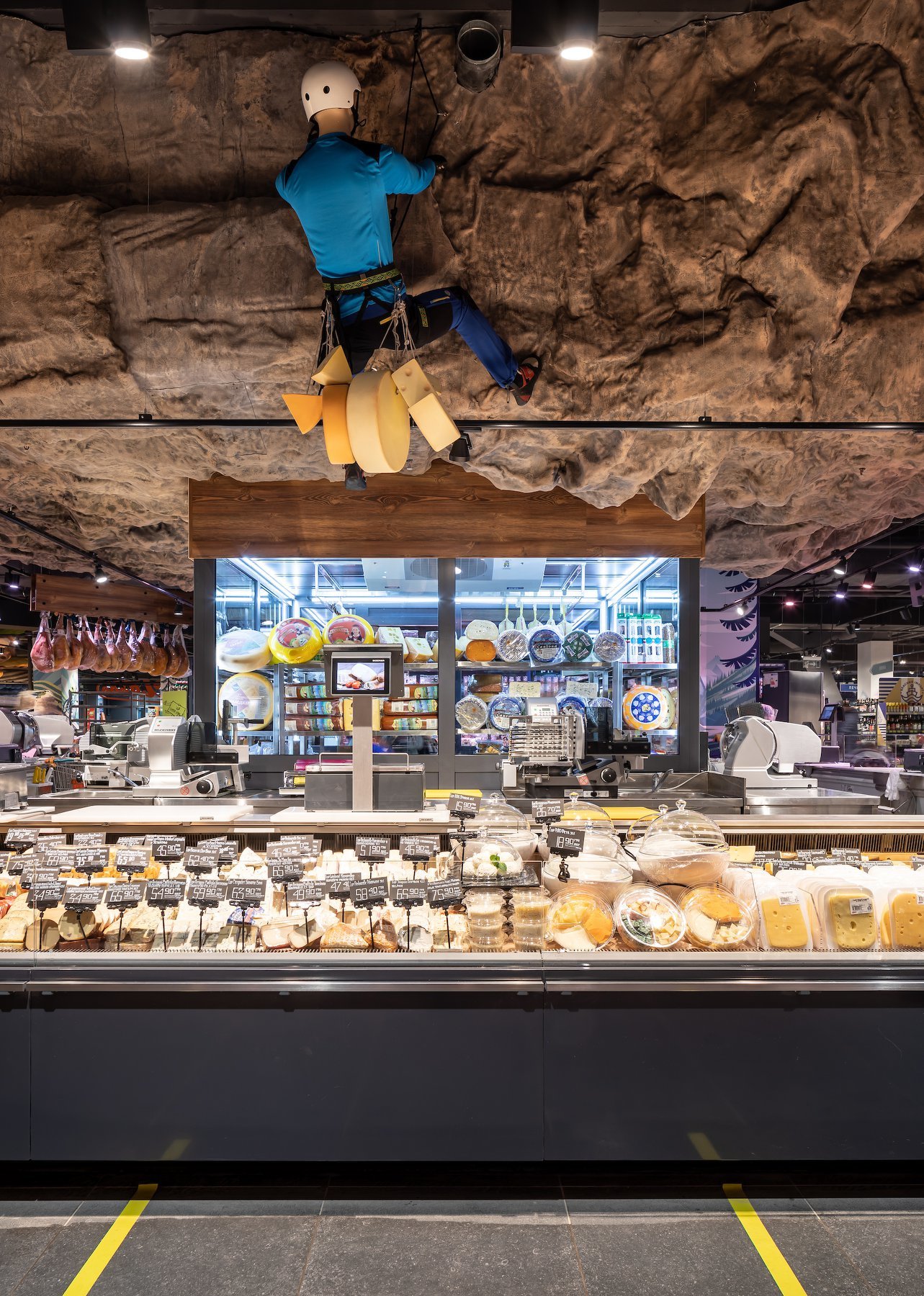 Супермаркет по мотивам отдыха в Карпатах. Здесь есть летние и зимние горные виды спорта и развлечения. Дельтаплан и лыжная маска, грибная поляна с огромной корзиной голубики. А на горе в гастрономии - скалолазы со снаряжением из колбасок и сыра.