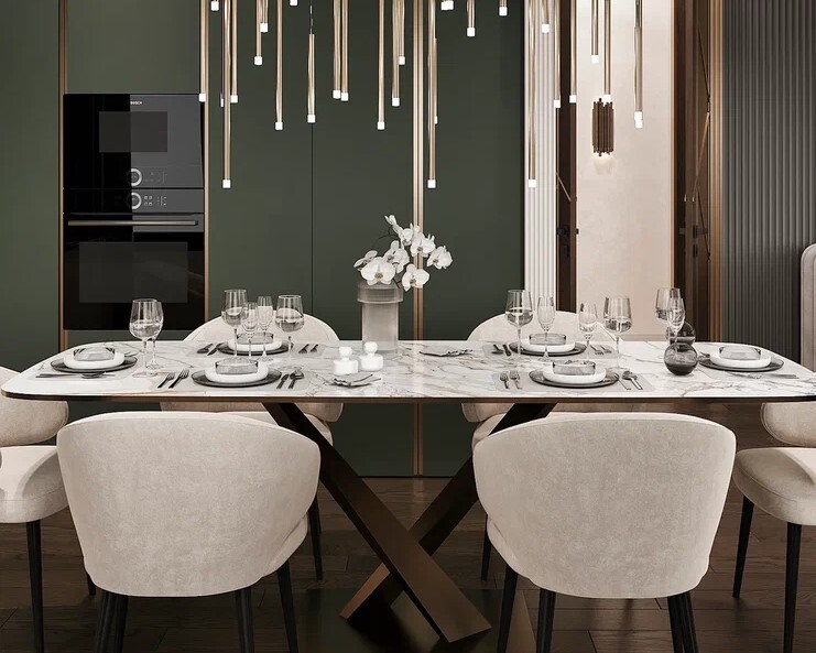 В обеденной зоне главным акцентом стал массивный стол с мраморной столешницей, который дополняют мягкие стулья с текстильной обивкой. Эффектный подвесной светильник завершает композицию, добавляя утонченности и шарма.